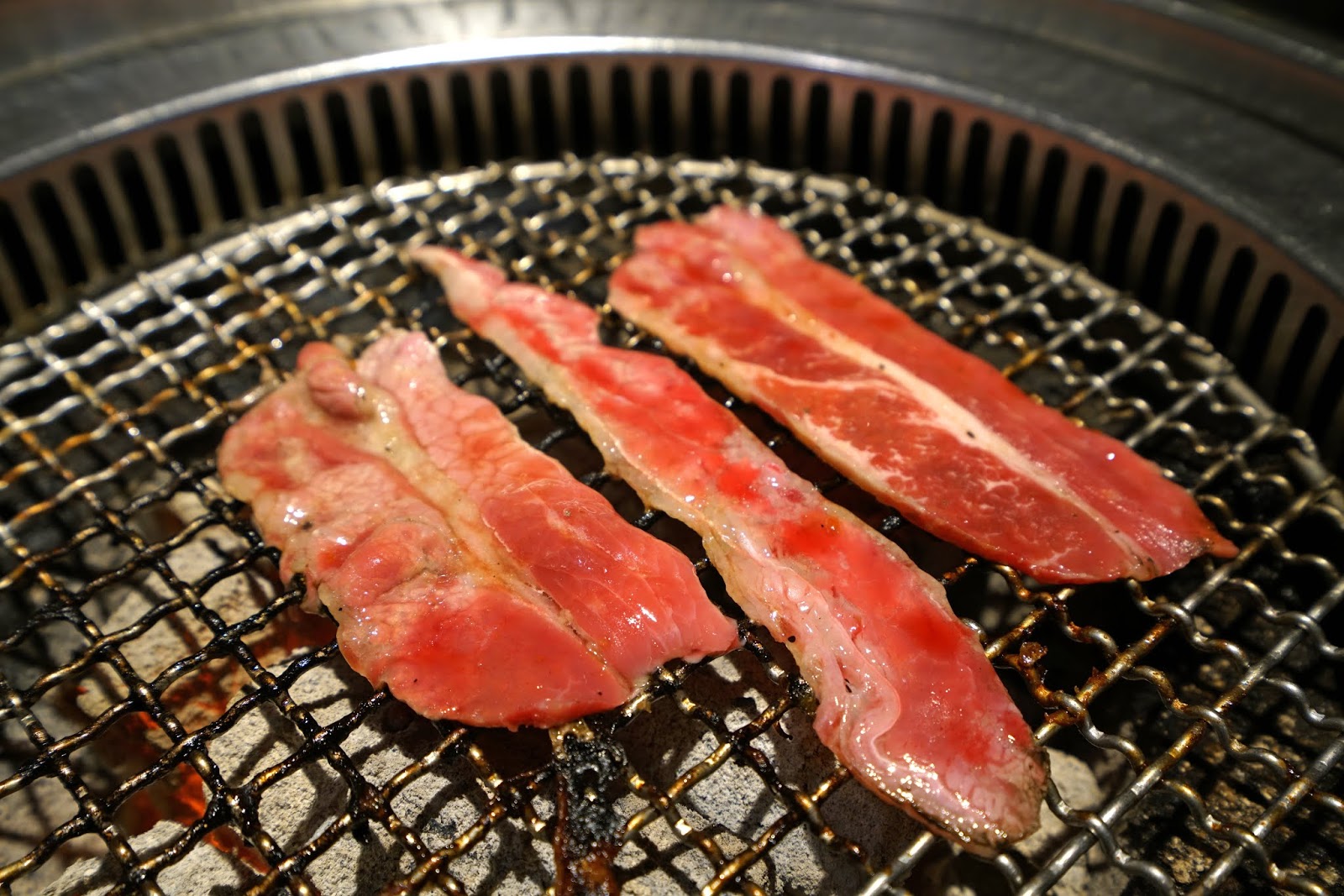新鮮的肉質,一烤下去肉汁迸出的色澤超吸引人的!不要烤得過焦,可以吃到霜降牛五花的嫩度和油脂的香氣!