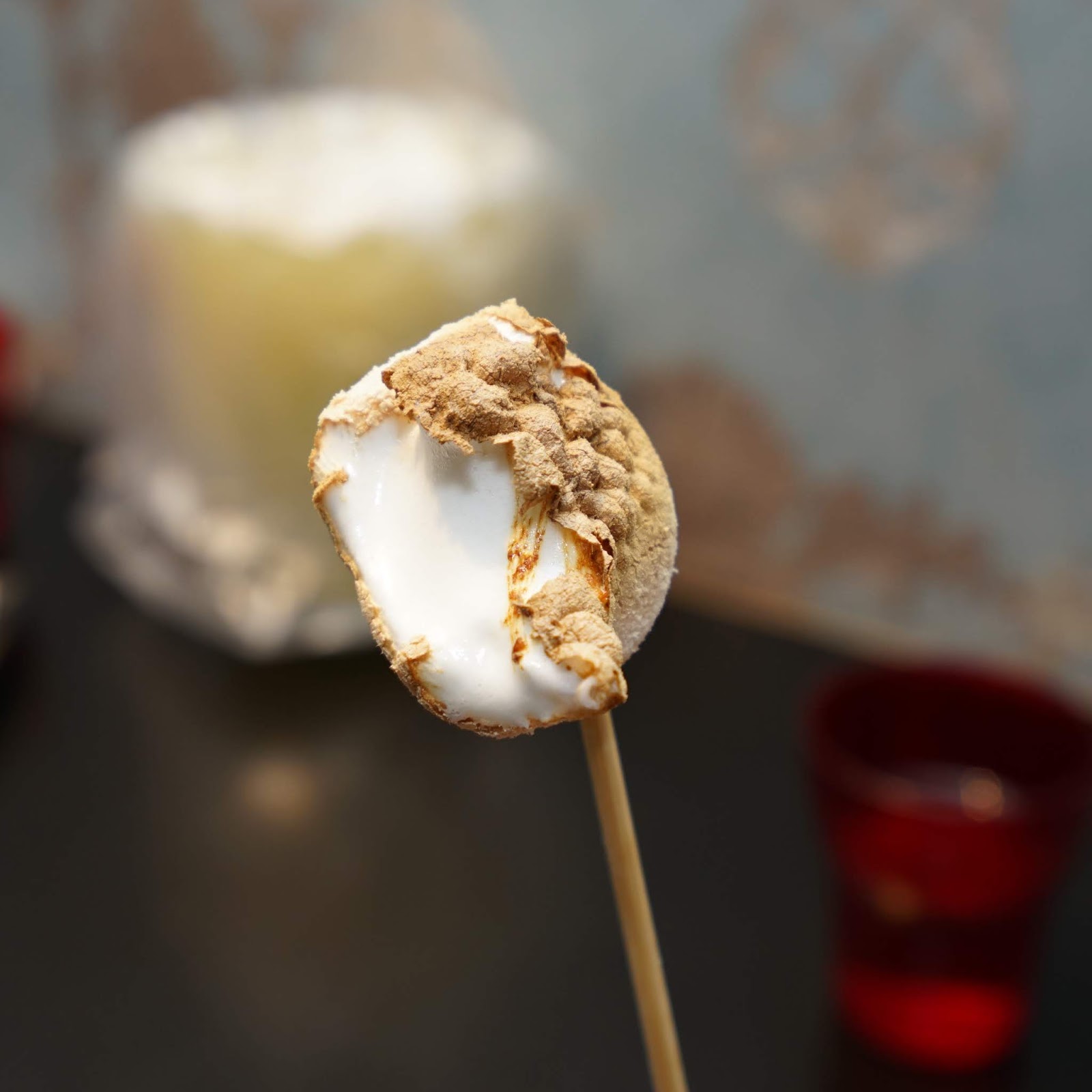 烤好的棉花糖,外表酥脆、裡層融化的流動感,口感吃起來非常驚豔!