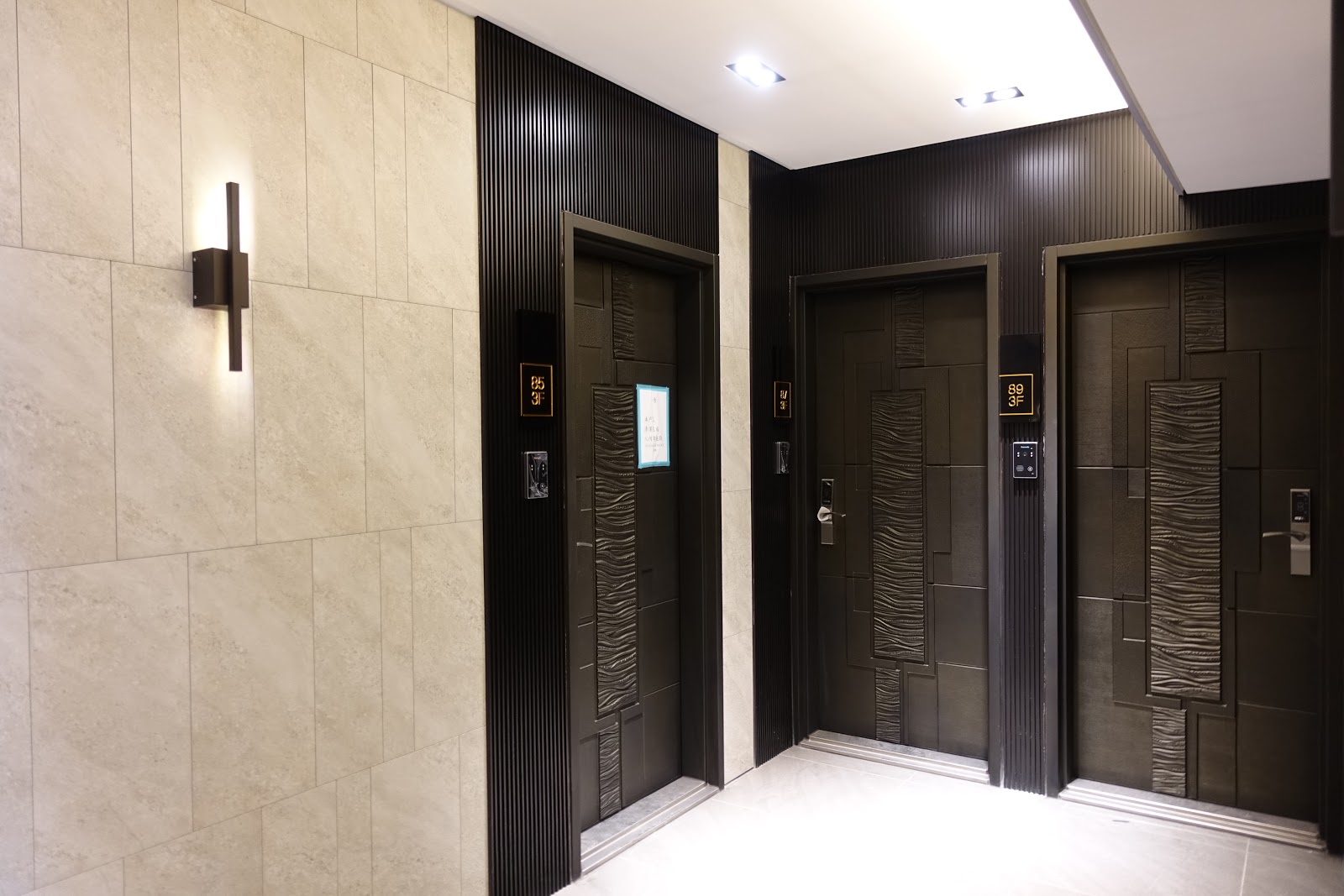 梯廳的走道寬敞有質感,每天出門、回家經過這樣燈光美氣氛佳的梯廳,心情超好,雖然以每層規劃5~8戶共用兩部電梯,上班時段可能會需要等待,但成本也反應在公設與公電上,以電梯的乘載量來看是還挺剛好的。