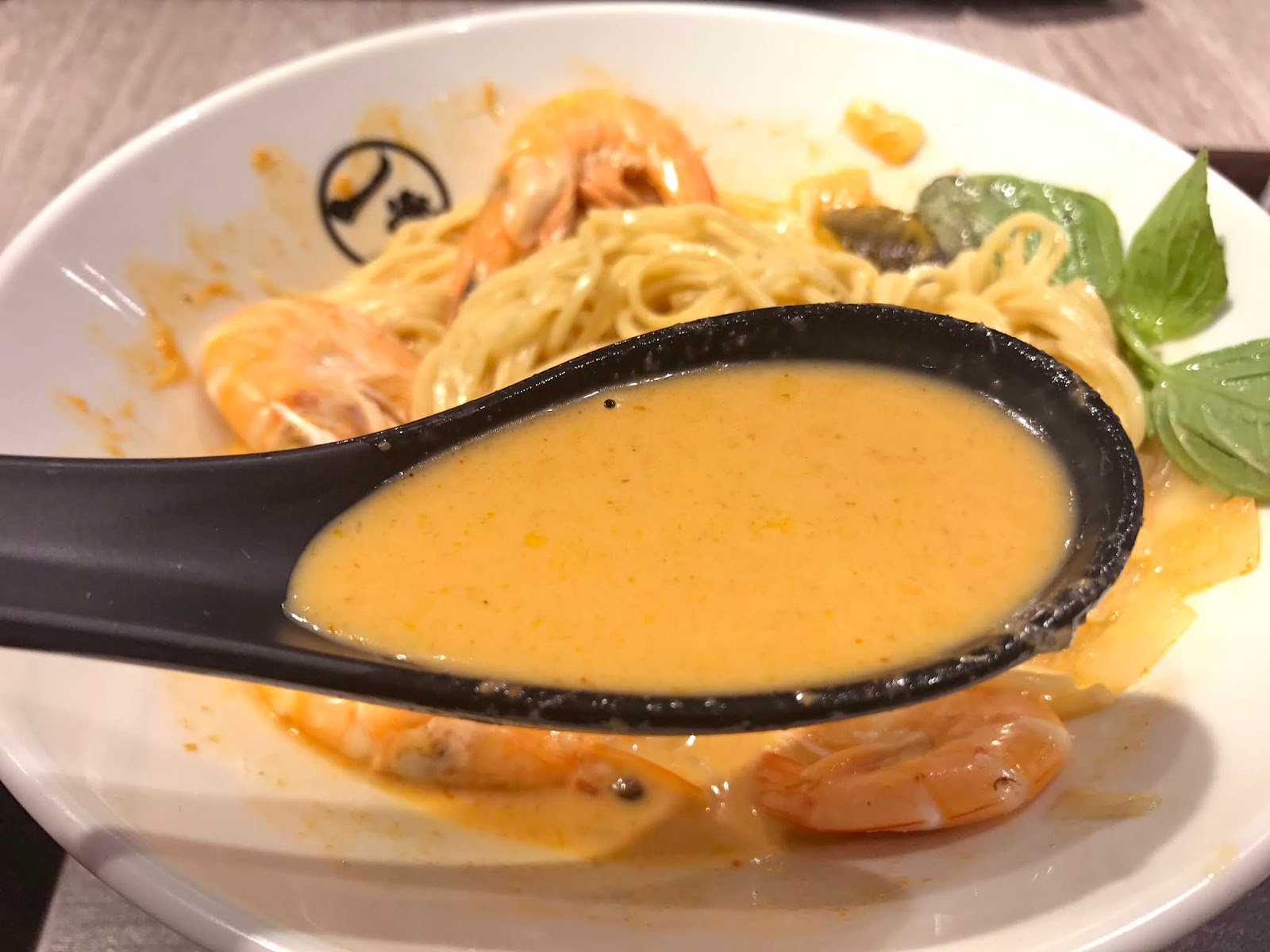 泰國紅咖哩鮮蝦拉麵的麵條口感Q彈,麵條附著香甜微辣的濃郁泰式醬汁,讓人一口接一口停不下來,四條鮮蝦的新鮮度非常好,彈嫩飽滿的蝦肉口感非常棒!