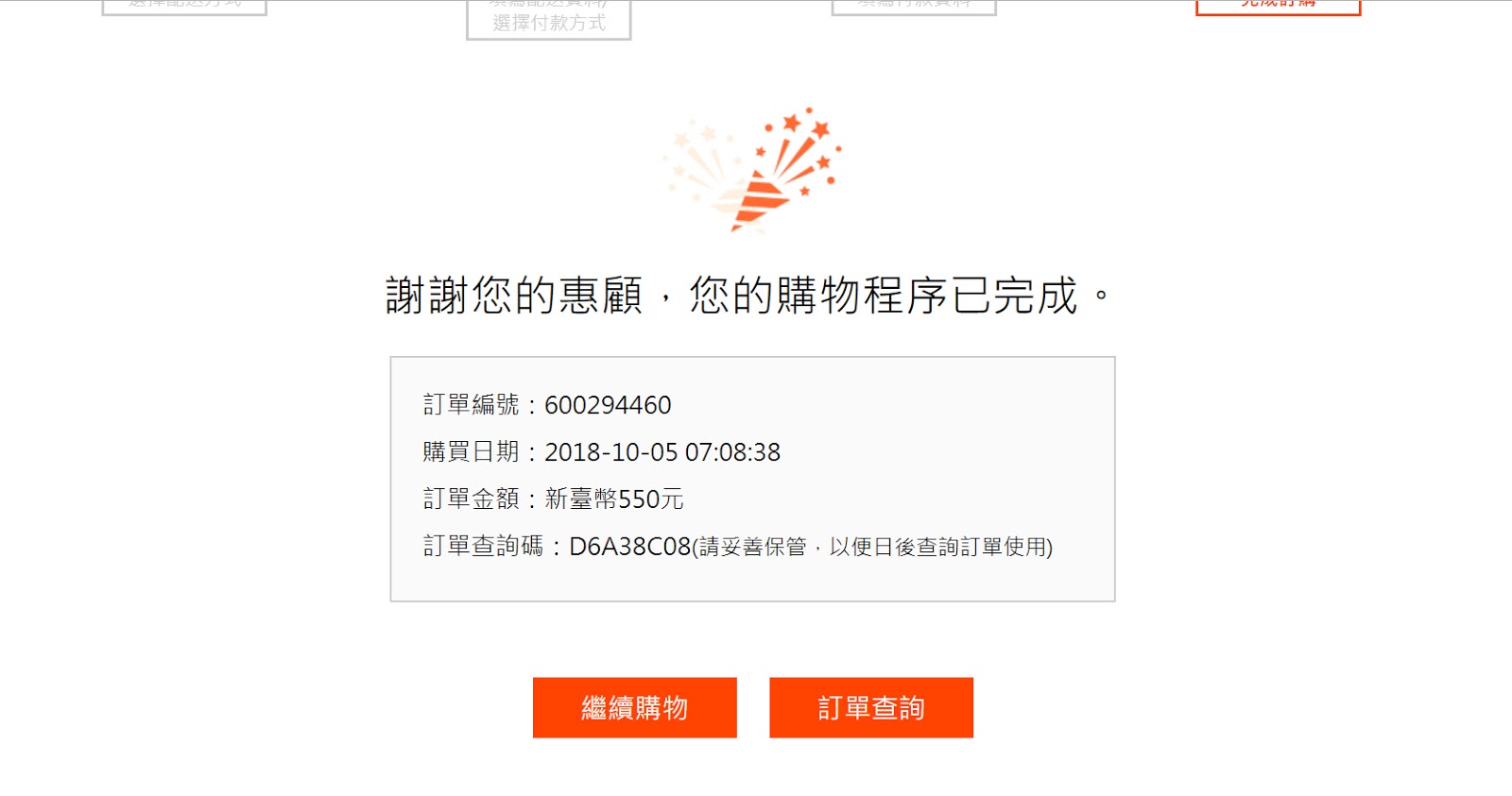 完成付款後,畫面會出現訂購編號,由於我沒有加入會員,所以一定要將訂購編號和訂單查詢碼記下來,之後才方便查詢訂單。