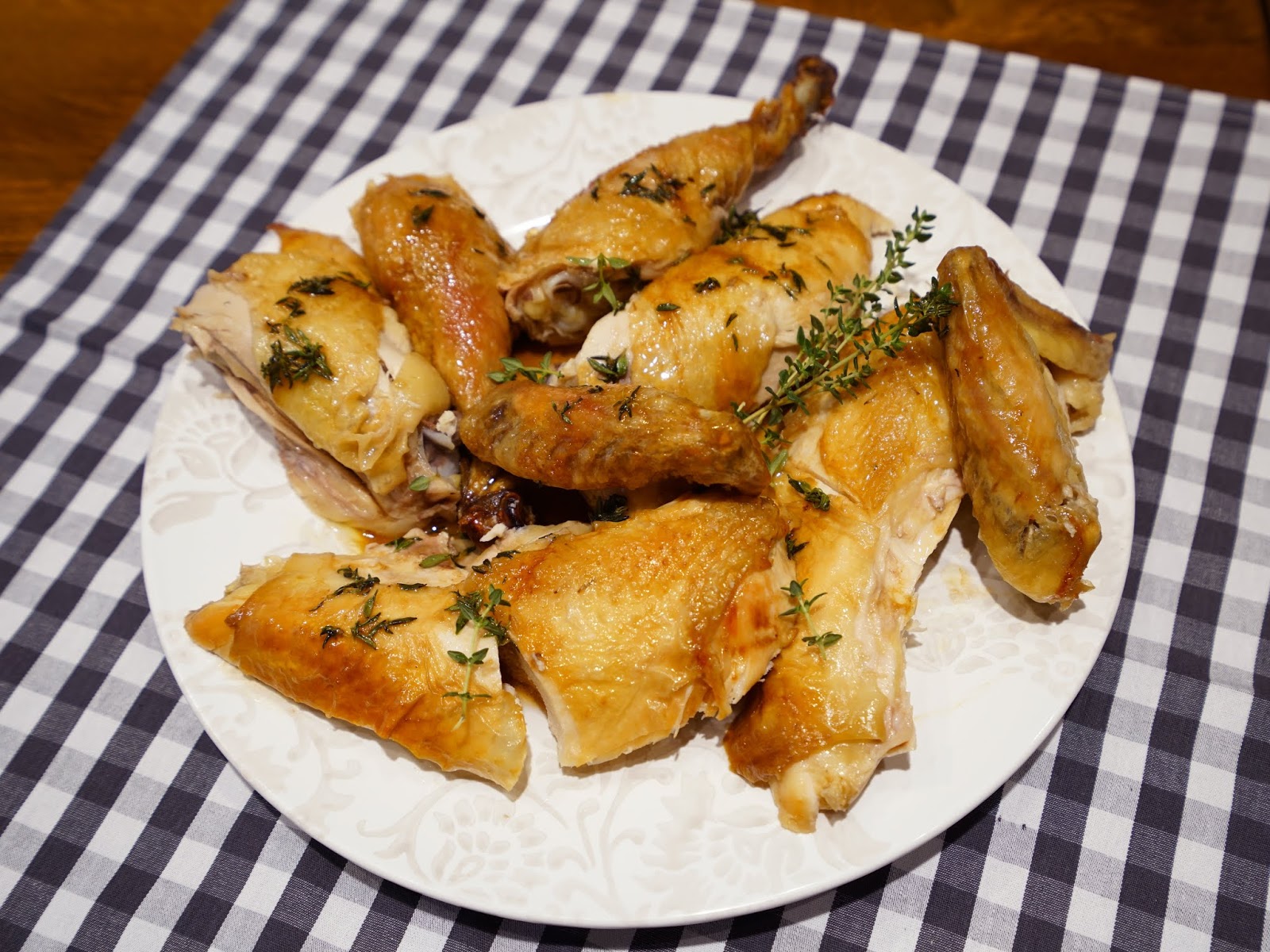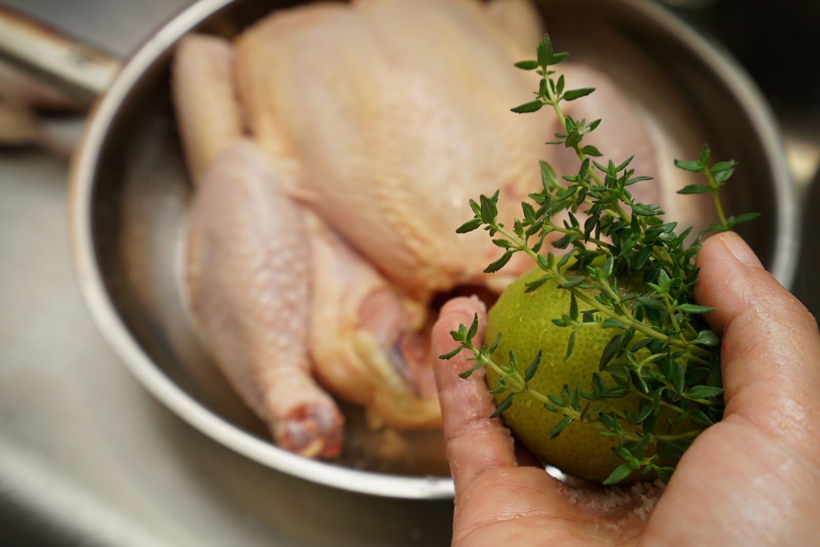 這次使用米其林餐廳常用的「薩索雞」來做烤全雞,完全不需要華麗的調味料就很好吃,由於薩索雞皮薄且油脂分布均勻, 用新鮮百里香與薩索雞的油脂結合,香氣迷人,僅用鹽提味,最能吃出薩索雞肉質鮮甜又緊實多汁的好口感!