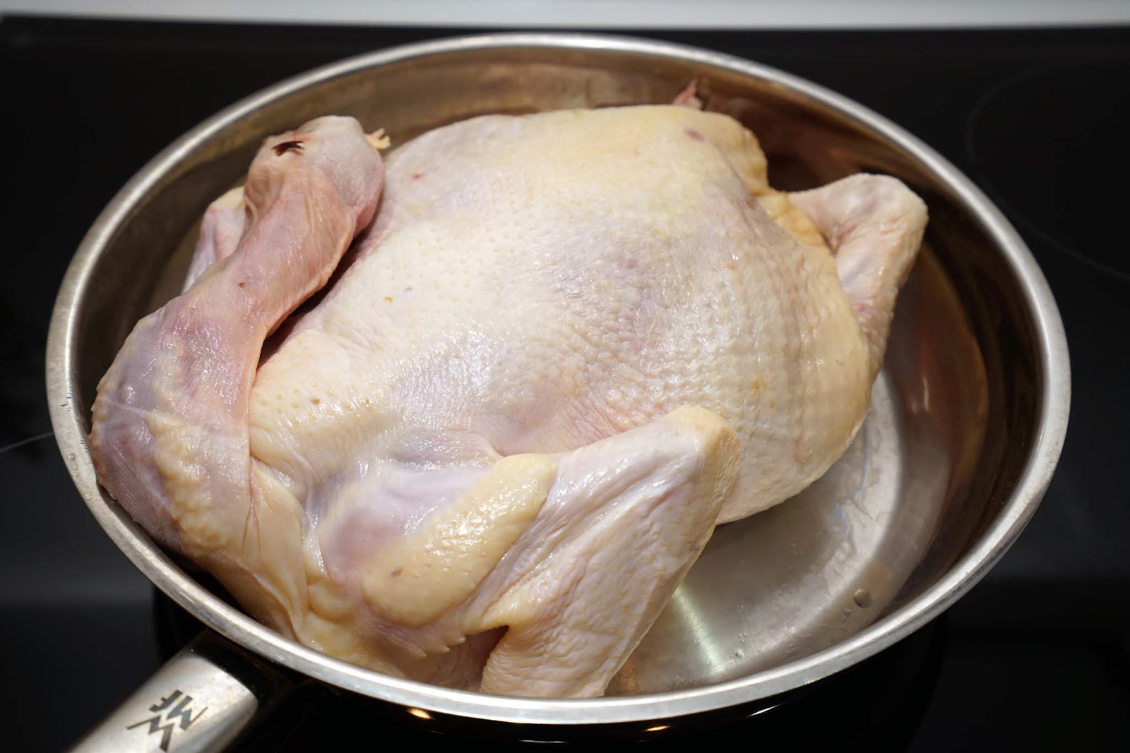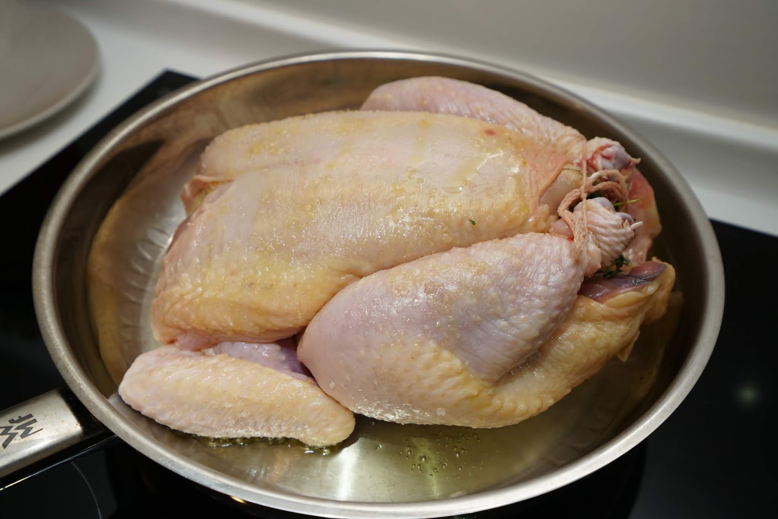 8.等橄欖油稍微出現油紋後,將全雞放入鍋中煎1分鐘(雞翅那面朝下)。