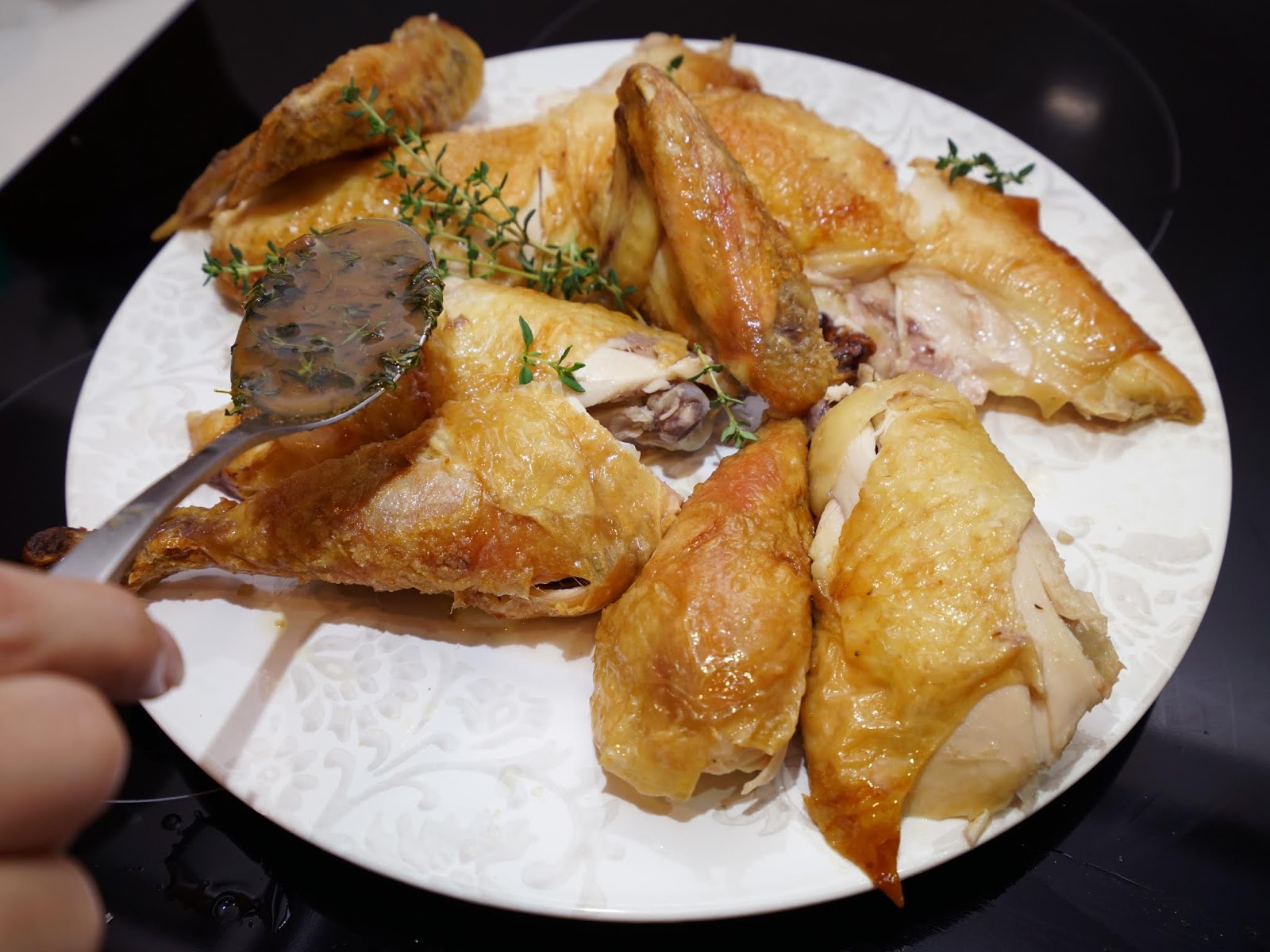 這次只用鹽及香草提味來烤全雞,最能吃到雞肉本身的鮮甜,「薩索雞」是我烤過最好吃的雞肉,肉質口感很特別,咬下去肉汁的香氣非常迷人,不但雞腿的口感彈性好,連雞胸肉都非常鮮嫩多汁。