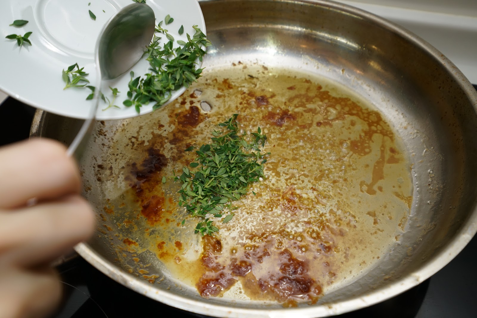 12.用同一支鍋子,將鍋子中部分雞汁先倒出,留下約一半的雞汁加入無鹽奶油繼續用小火煮,然後將百里香的葉子拔下來,倒入雞汁中煮滾做成百里香醬汁。