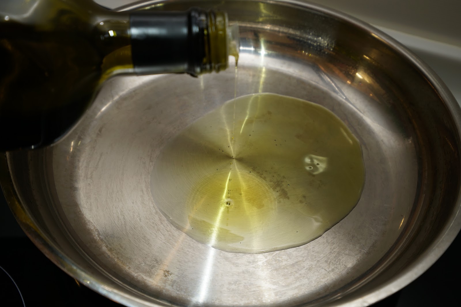 7.使用平底鍋,熱鍋後倒入橄欖油。
