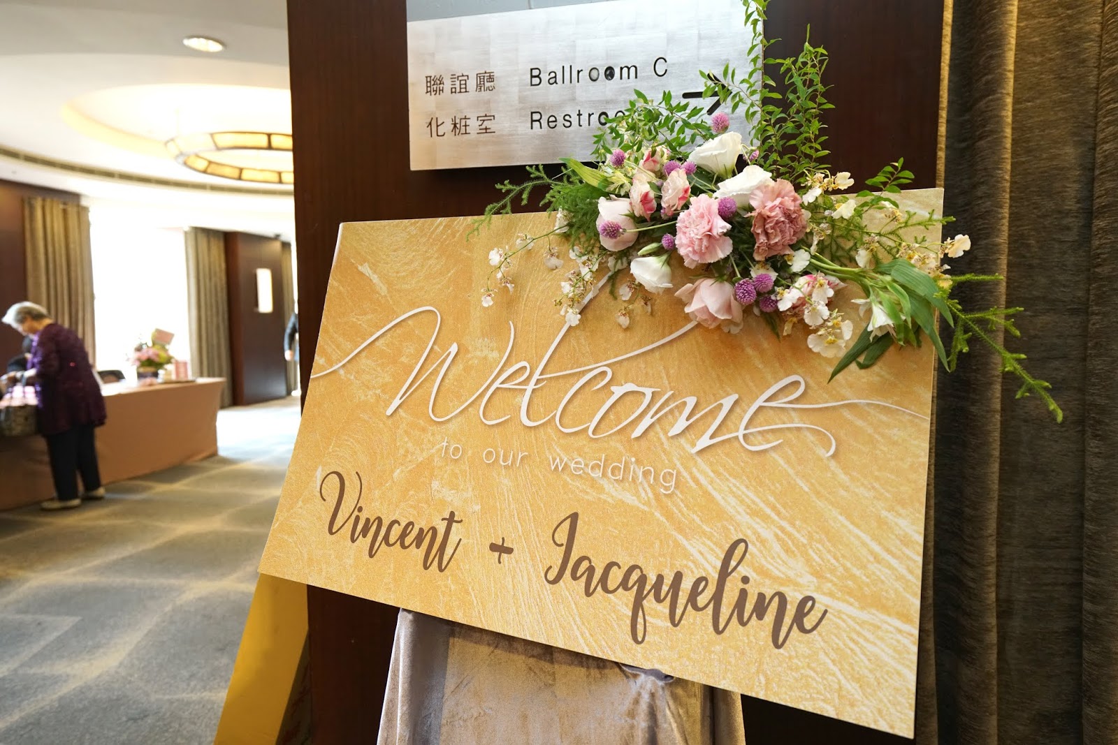 引導賓客進入會場的歡迎立牌,也綴上協調性一致的清新花卉,讓人一進門就覺得好優雅。