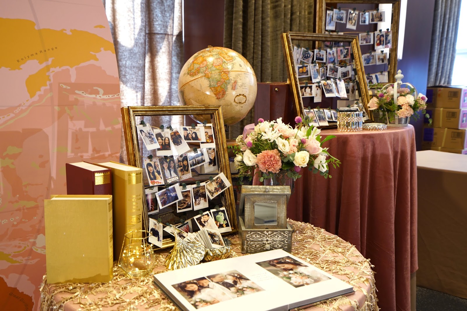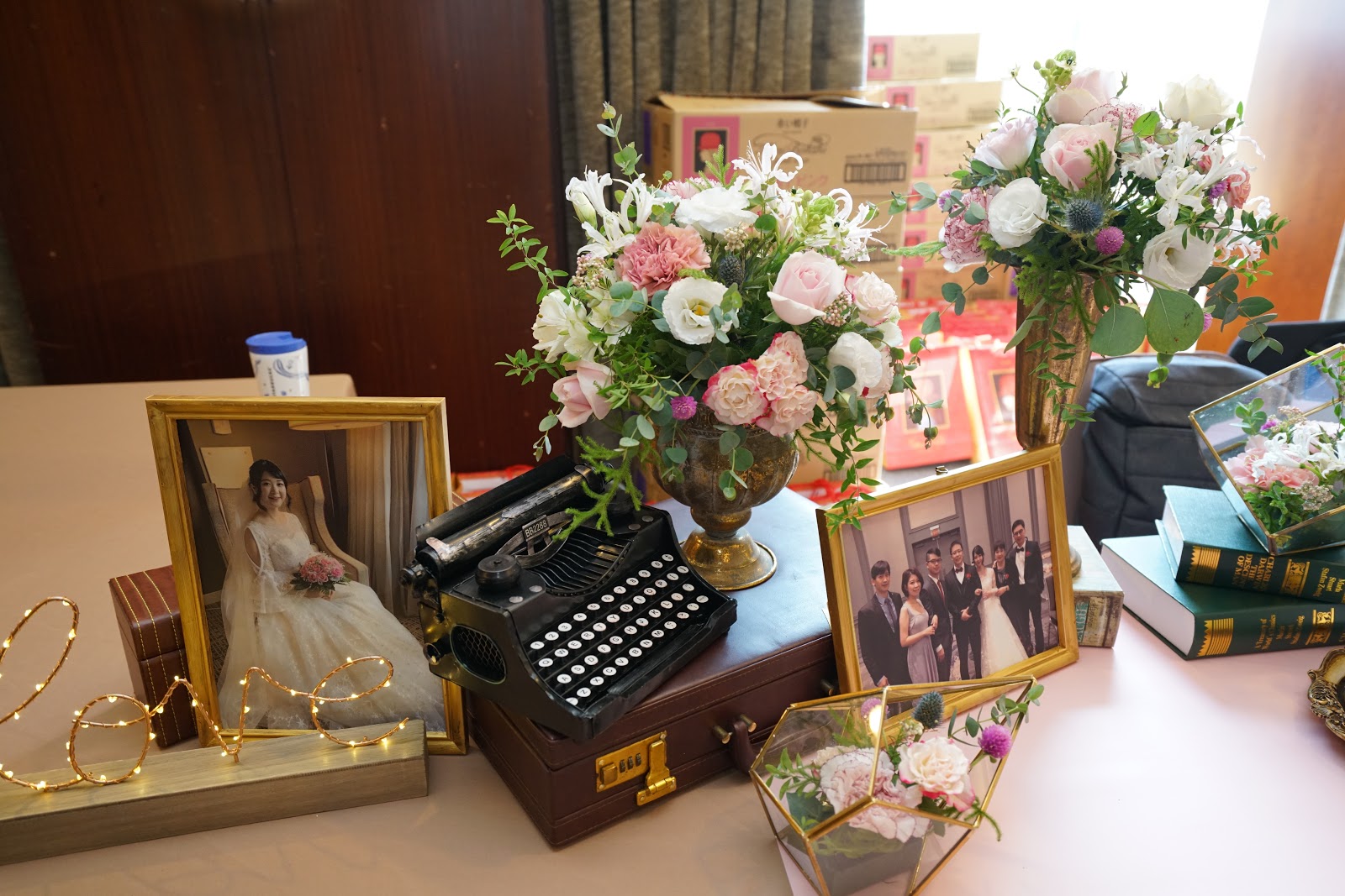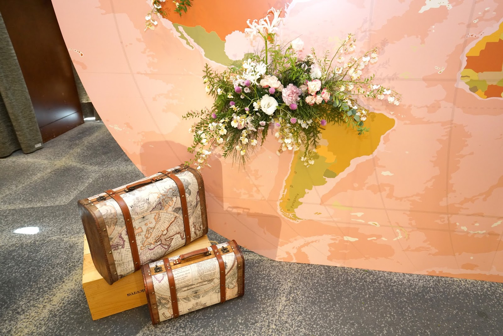 由於新郎新娘是在國外求學認識的,所以這場婚禮佈置以世界旅行為主題,所以特別用了許多跟旅行有關的物件,例如行李箱、地球儀等來佈置婚禮會場,營造出環遊世界的氛圍,並且用了很多精緻又復古、鑲著金屬邊的玻璃花器來擺設,讓桌飾看起來更有深度。