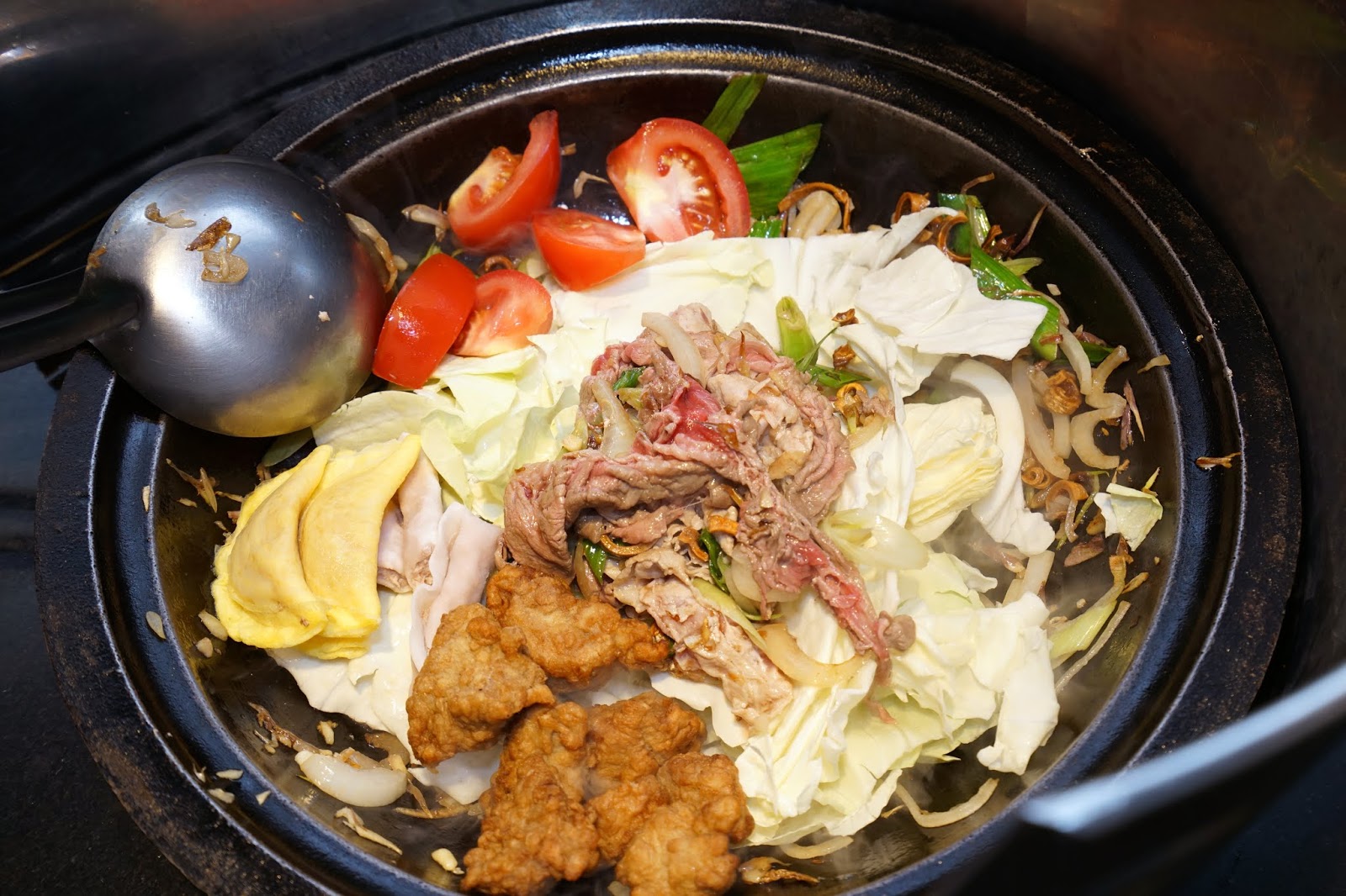 肉類和蔬菜等食材都在這時全部放入,然後倒入高湯一起煮!