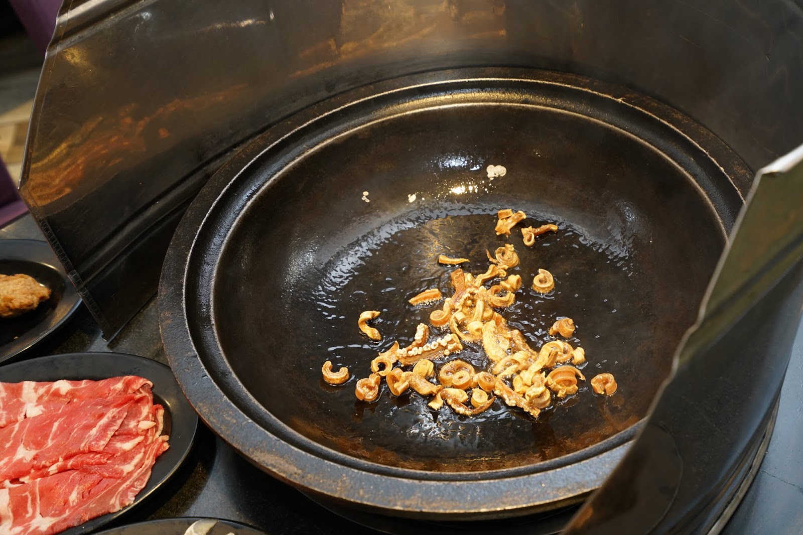 等第一批食材都拿好放在桌上,店員就會幫忙把保鮮膜都拆除,一邊開始熱鍋準備要炒鍋底!由於是第一次來吃,店員提醒我要拿炒鍋底用的魷魚和蒜苗,這樣炒出來的湯頭更鮮甜。