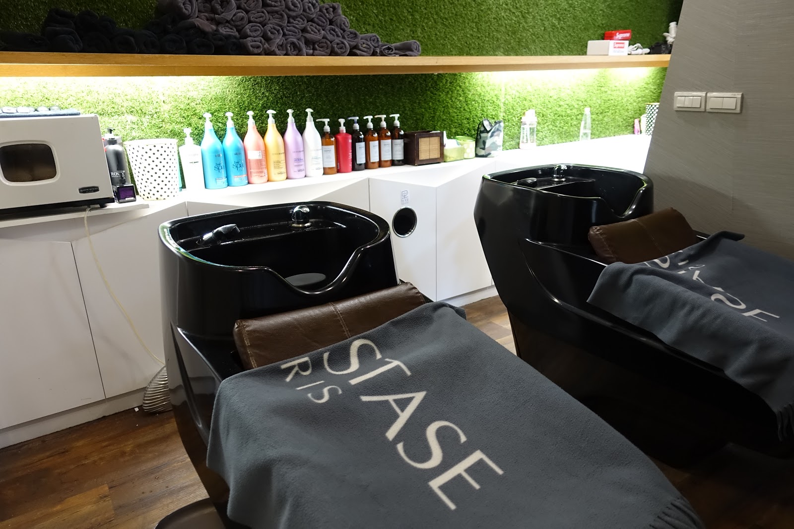 空气概念沙龍八館的洗頭區讓人覺得靜謐又舒適,洗之前先用遮面紙貼在額頭上、蓋上毯子就可以閉上眼睛休息一下,針對我的頭皮及髮質狀況,第一次用頭皮舒緩洗髮精洗,第二次用保濕洗髮精,在洗頭過程中還會適時地做頭部按摩,整個過程非常舒服。