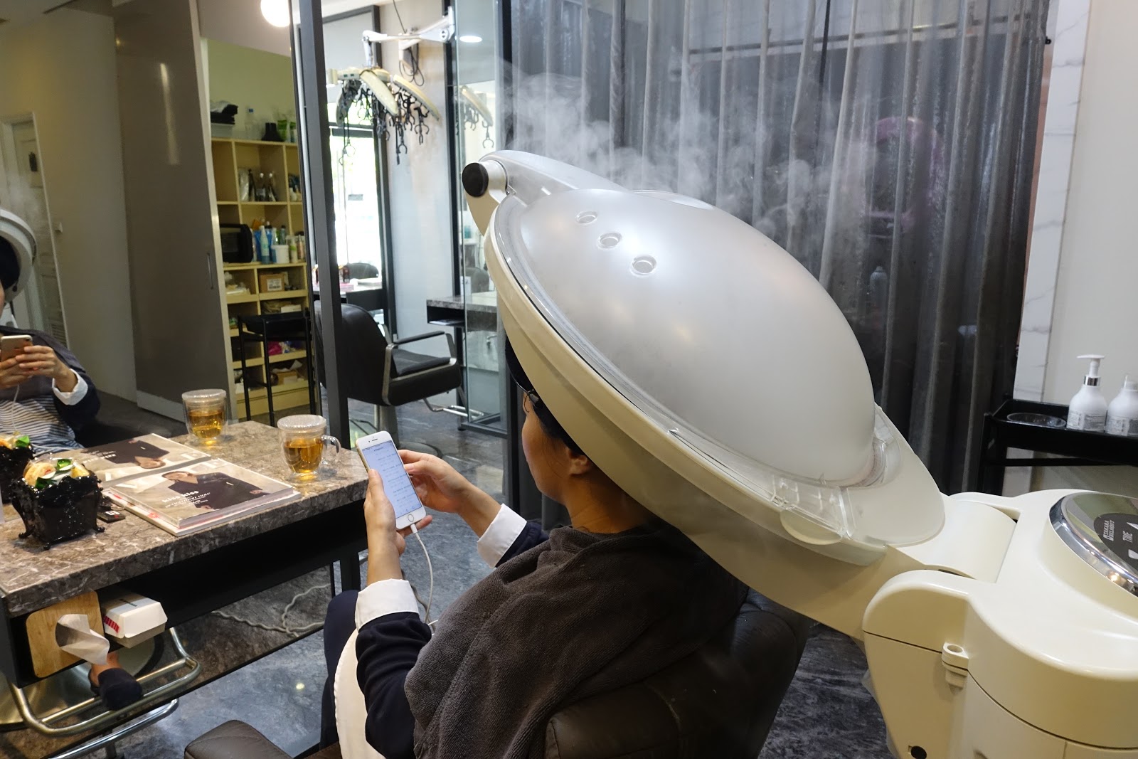 最後套上蒸氣帽將頭髮完全包住再用蒸氣蒸,蒸氣看起來很熱但其實很溫和舒適。