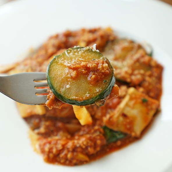加了不少當季的櫛瓜和杏鮑菇,營養滿滿~另外也有經典肉醬頓飯的版本喔!