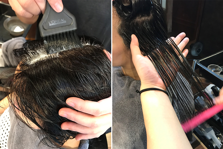 將ULTRA REPAIR護髮乳仔細地塗刷在每一根髮絲上,最後捲成空心捲,再用蒸氣去蒸,幫助頭髮吸收。