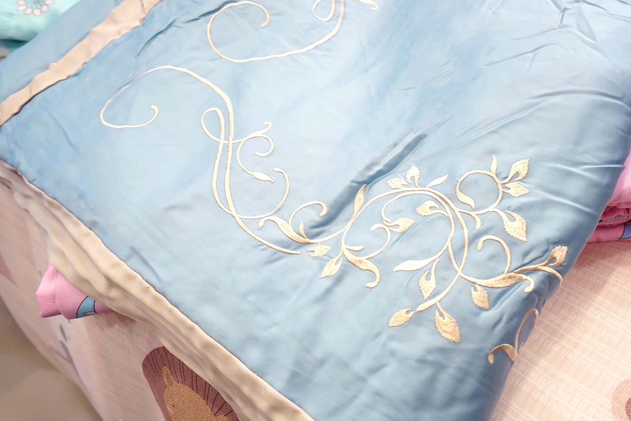 這次我覺得最特別的是這款頂級刺繡的天絲床包兩用被組,摸起來像絲緞般的滑順又有光澤,精緻的刺繡花紋,很有高級感,天絲材質在夏天睡起來格外涼爽,觸感非常好!無論是視覺或觸感都令人滿意,可說是一款高CP值推薦。
