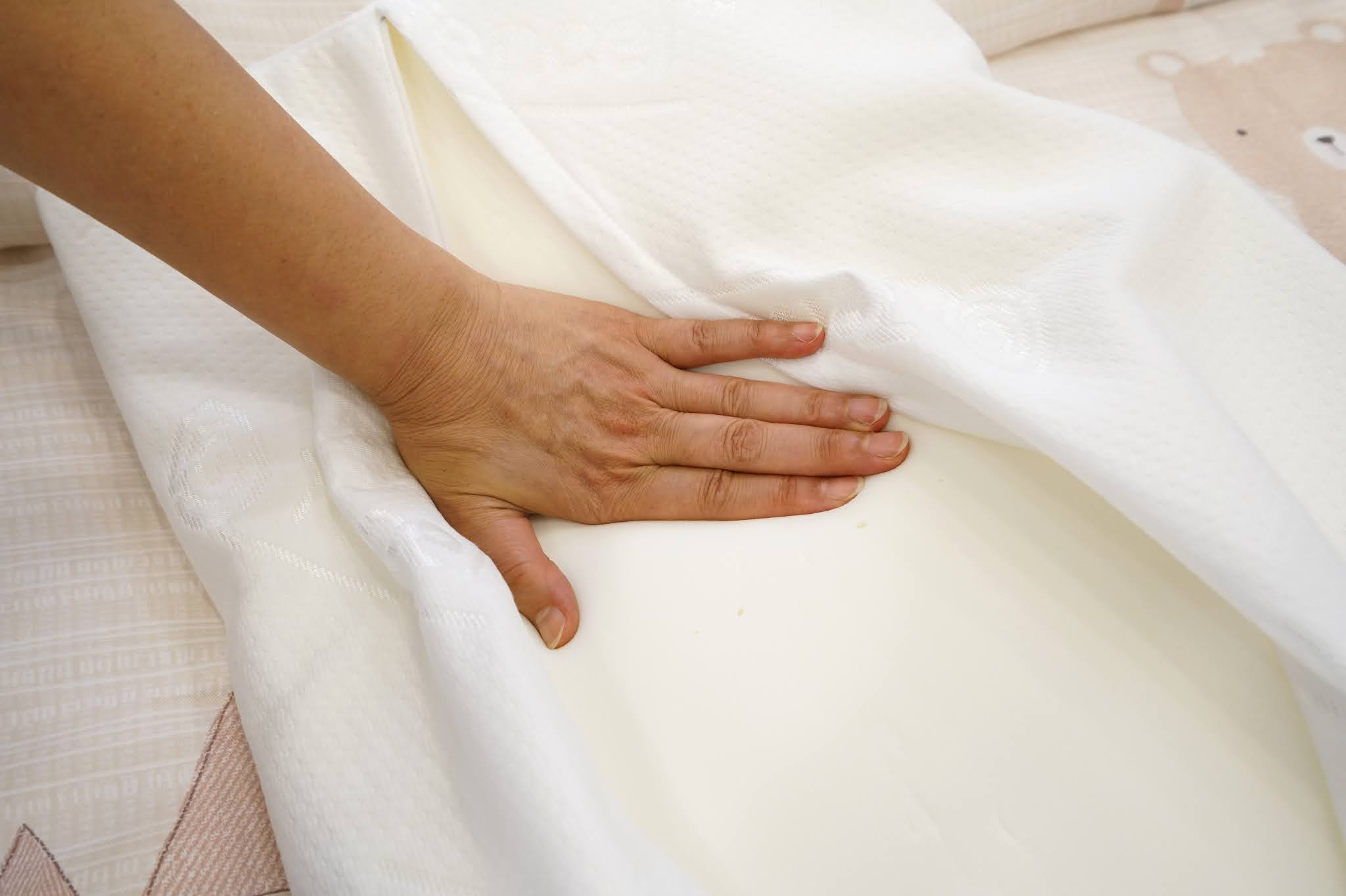 拉開拉鍊,乳膠枕摸起來有冰冰涼涼的觸感,歡迎大家親自來體驗。