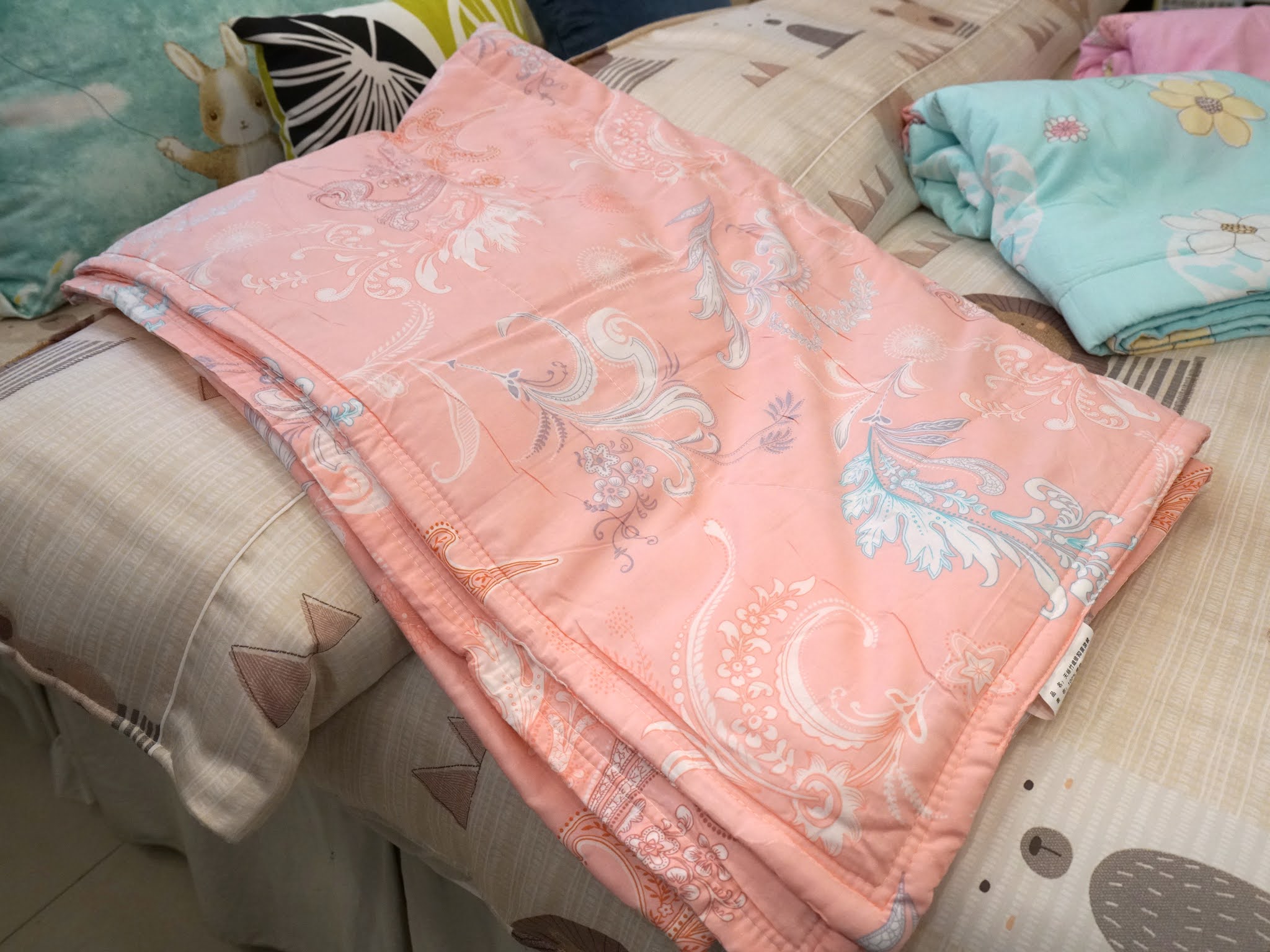 在夏天一定要把棉被收起來換蓋涼被,才不會睡到一半被熱醒,這款天絲竹纖材質擁有親膚的特性,睡覺翻身時也不易滑落,柔嫩的色調非常漂亮!現場還有很多顏色可以選擇,也有很多適合小朋友的可愛圖案唷!