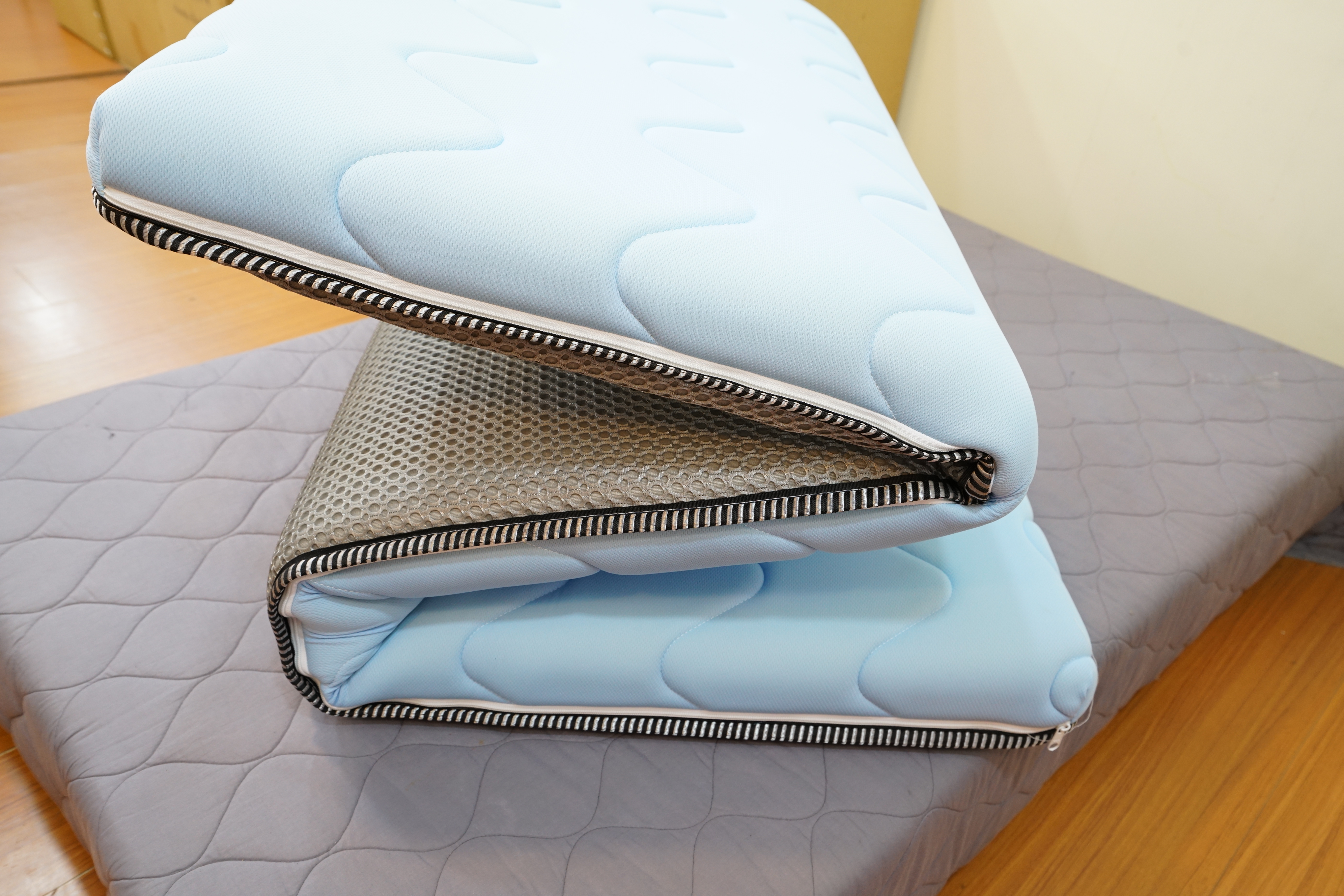 它擁有10公分厚度,彈力比一般乳膠床墊更柔軟!表層是透氣棉、反面選用三明治透氣網布,拉開拉鍊裡面床墊表布為3M吸濕排汗材質,內夾層有5公分的獨立筒彈簧及2公分的記憶棉,按壓下去感覺很Q彈!