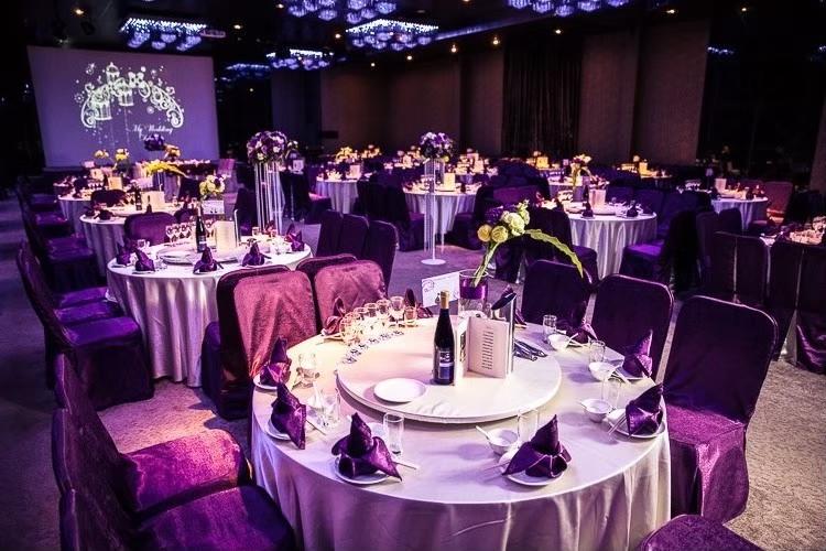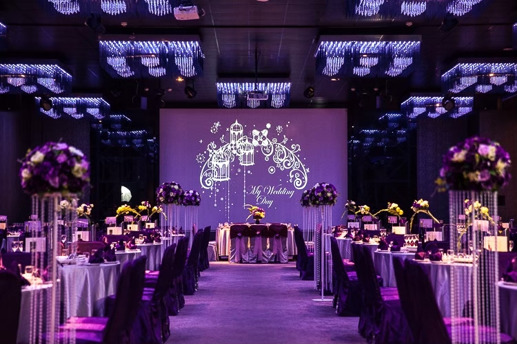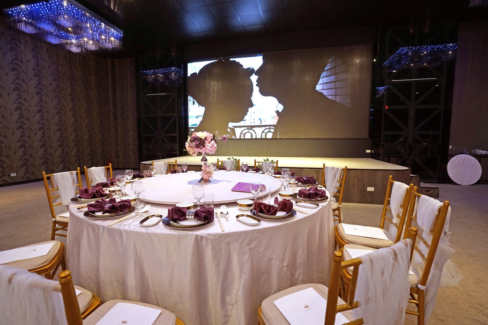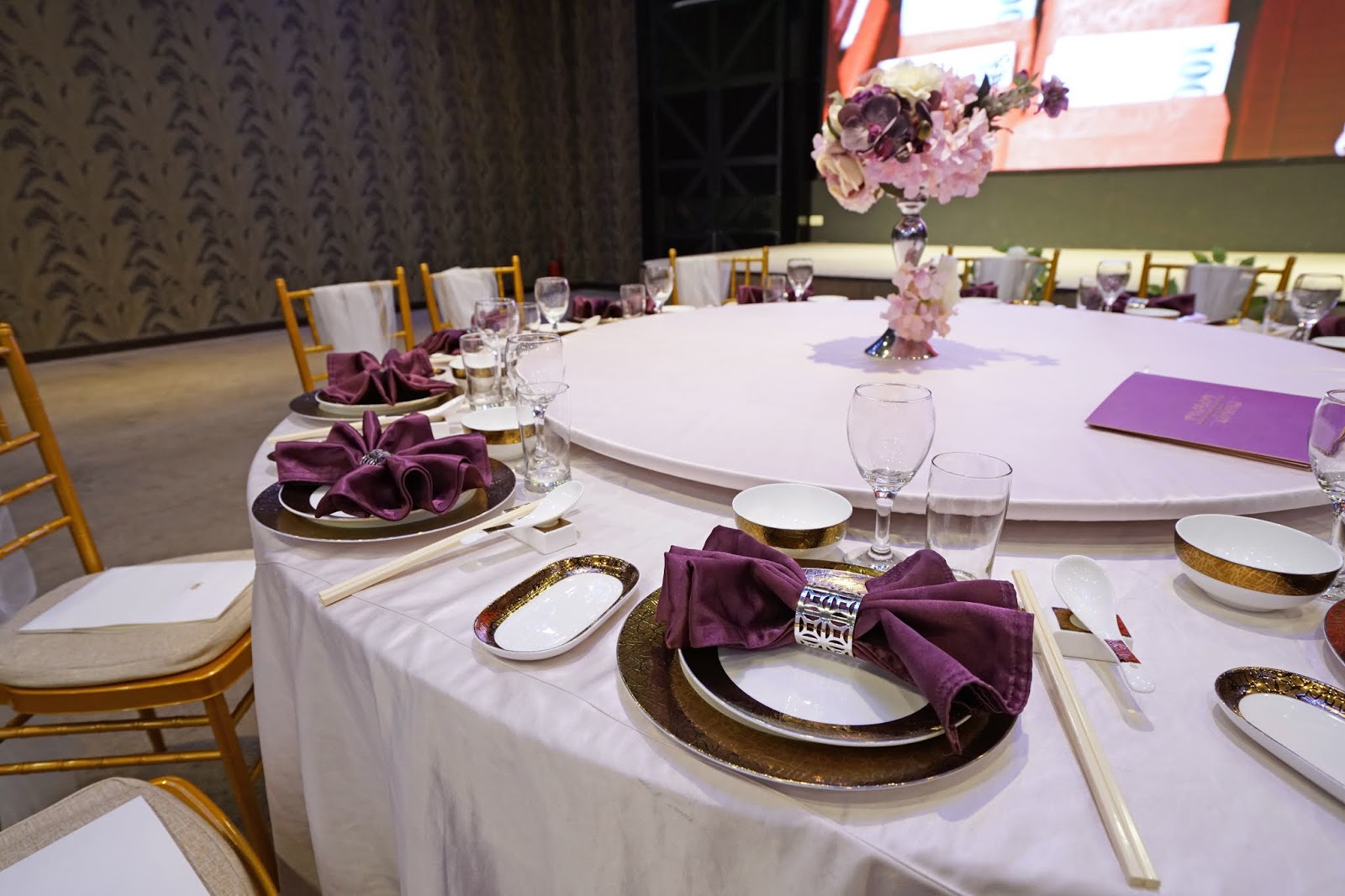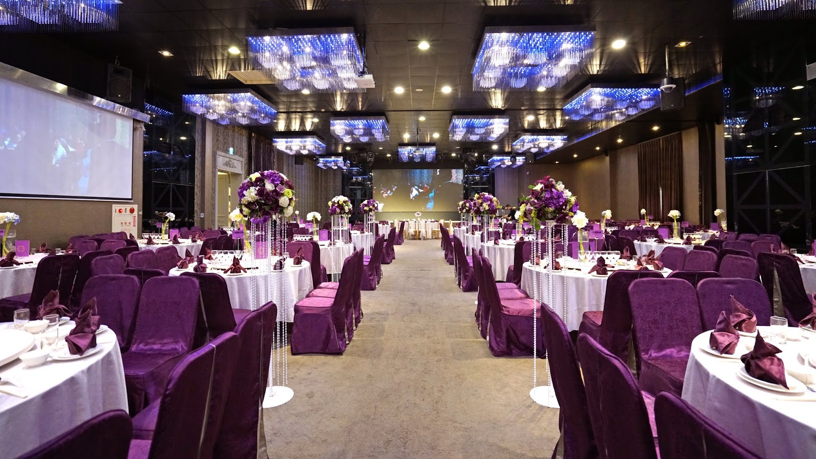 低調奢華的紫色系宴會廳,整場無樑柱限制,並有3個投影螢幕設備及2個LED電視牆,讓全場所有親友都能看到新人進場及婚禮影片。