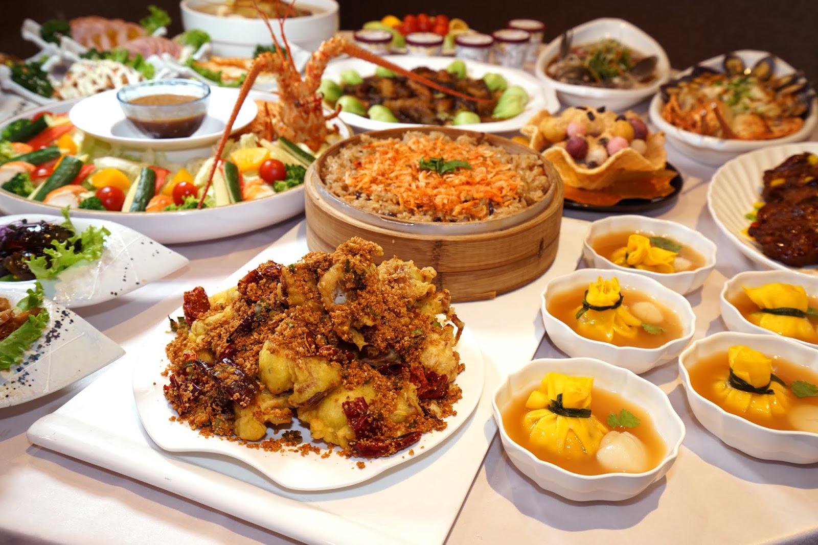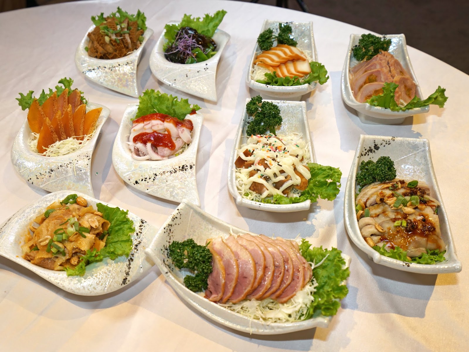 「十全十美滿漢皿」包括珍貴的烏魚子,四川名菜口水雞、大薄片、川椒皮蛋,創意料理金桔雞捲,海鮮類的有鮑魚角、煙燻花枝、中卷,燉得軟嫩又冰鎮得Q彈爽口的豬腳、滷牛肚,一開場就讓大家超驚豔!以川菜變化出的冷前菜,和一般喜宴前菜格外不同!