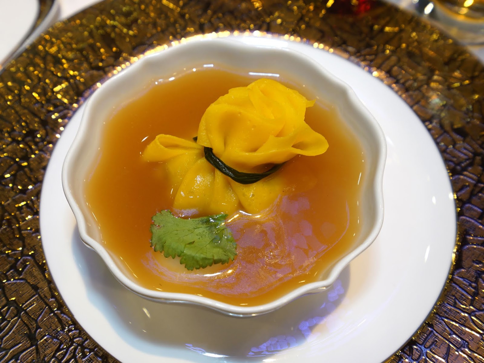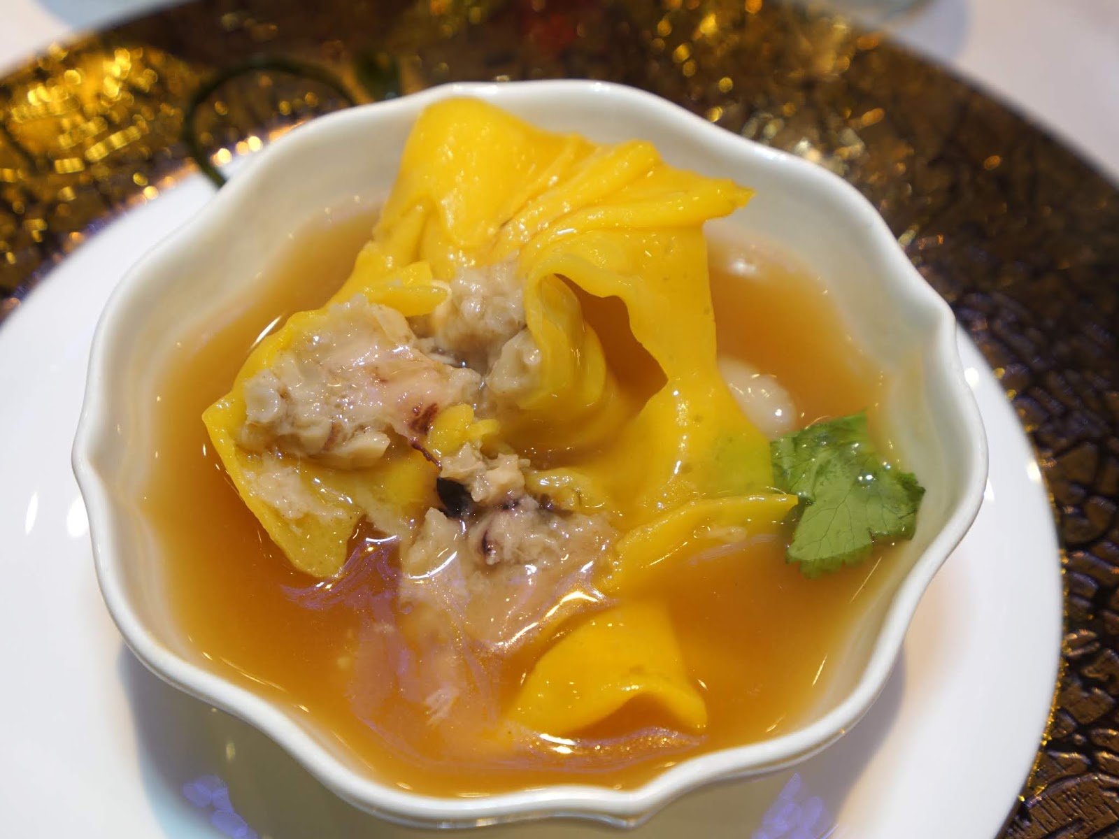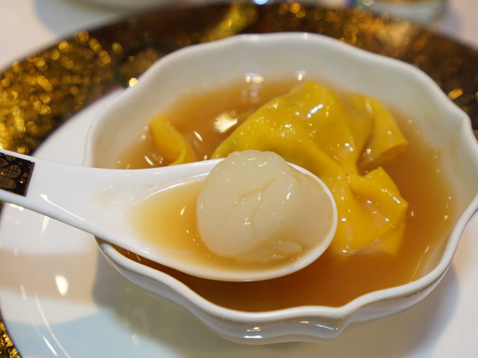這道「琉璃鳳眼襯帶子」是道繁複的手工菜,加入大骨、豬皮熬成的海鮮濃湯,滋味醇厚香濃,手工製作的金黃色福袋看起來就很喜氣,濃湯裡還有一整個碩大的干貝。