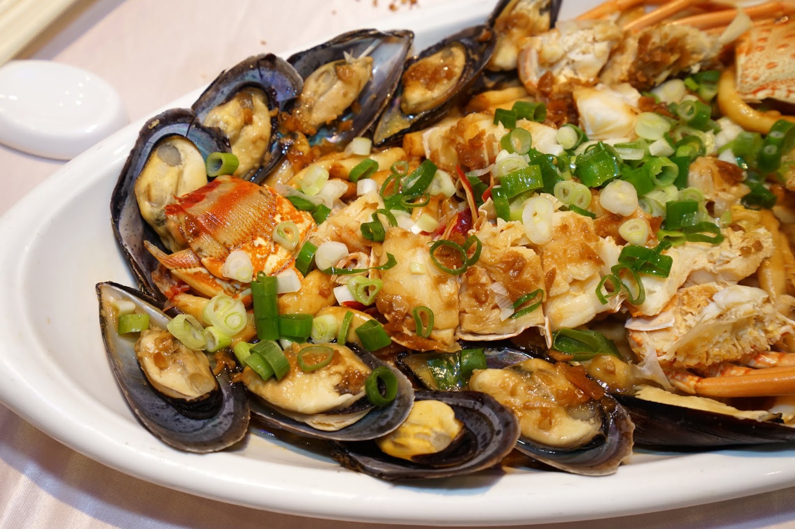 「蒜蒸雙鮮海味合」將龍蝦與淡菜結合成這道菜,底下還有粿仔條,以蔥蒜調味蒸出龍蝦、淡菜的的鮮甜,沒有過多調味的龍蝦肉吃得到原汁原味的鮮甜!底下的粿仔條吸附了海鮮的滋味,吃起來鮮甜入味!