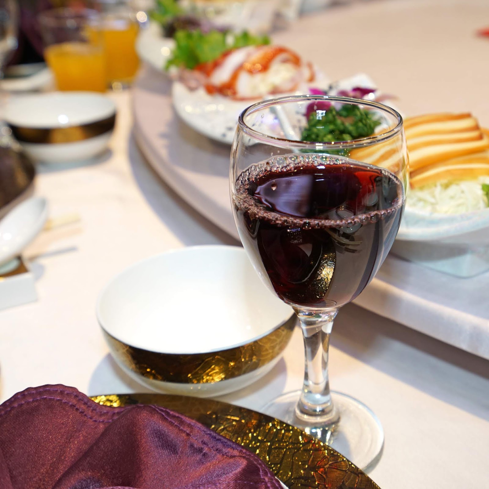 金色的餐瓷與紫色餐巾相襯,非常有質感,帶出華麗富貴的氛圍。