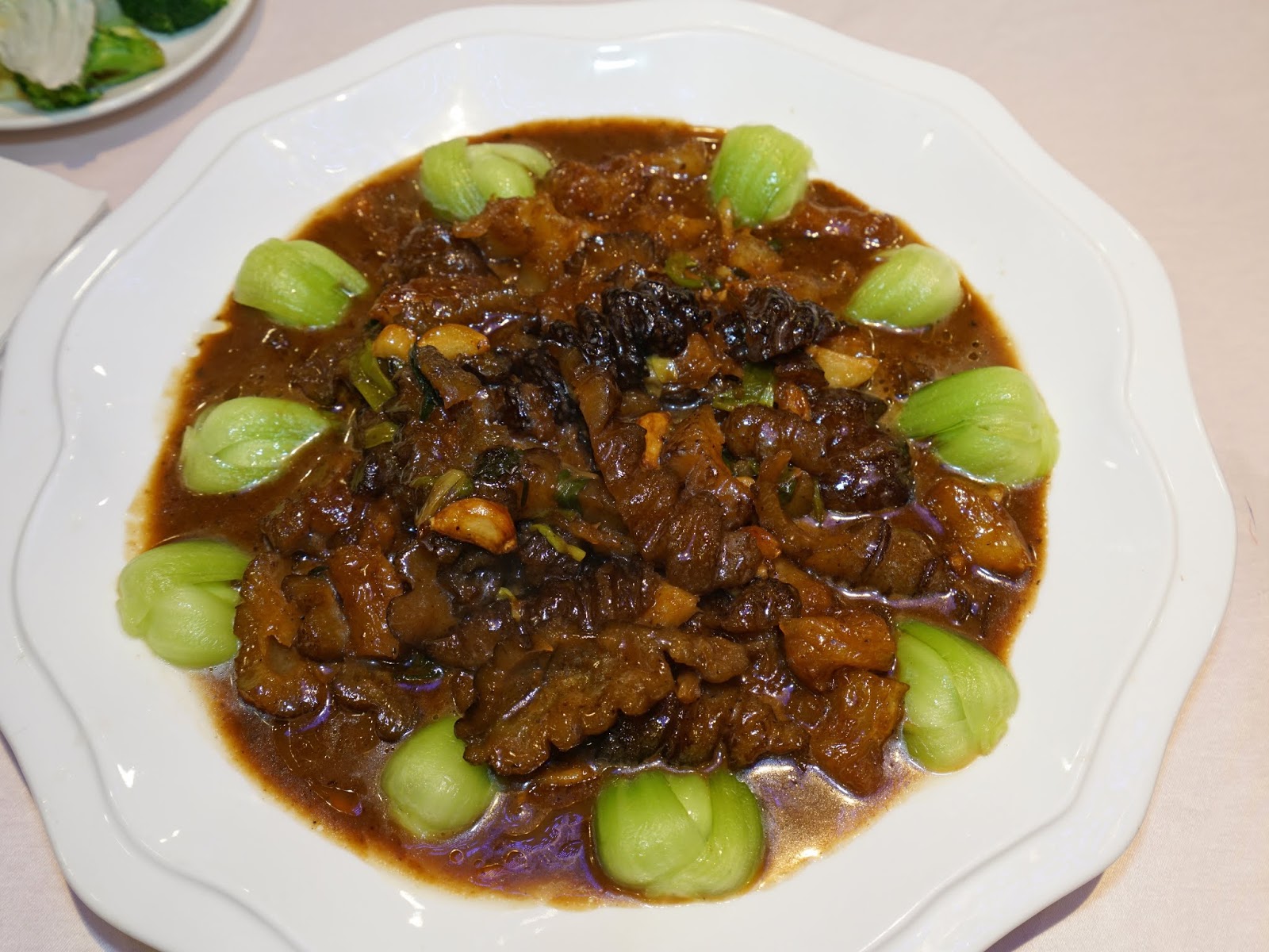 「翡翠蹄筋燴烏參」用料非常豪邁,吃得到整條海參,蹄筋也燉得很軟嫩,蠔油醬汁讓海參、蹄筋的口感更滑順融合,青江菜吃起來更甜脆。