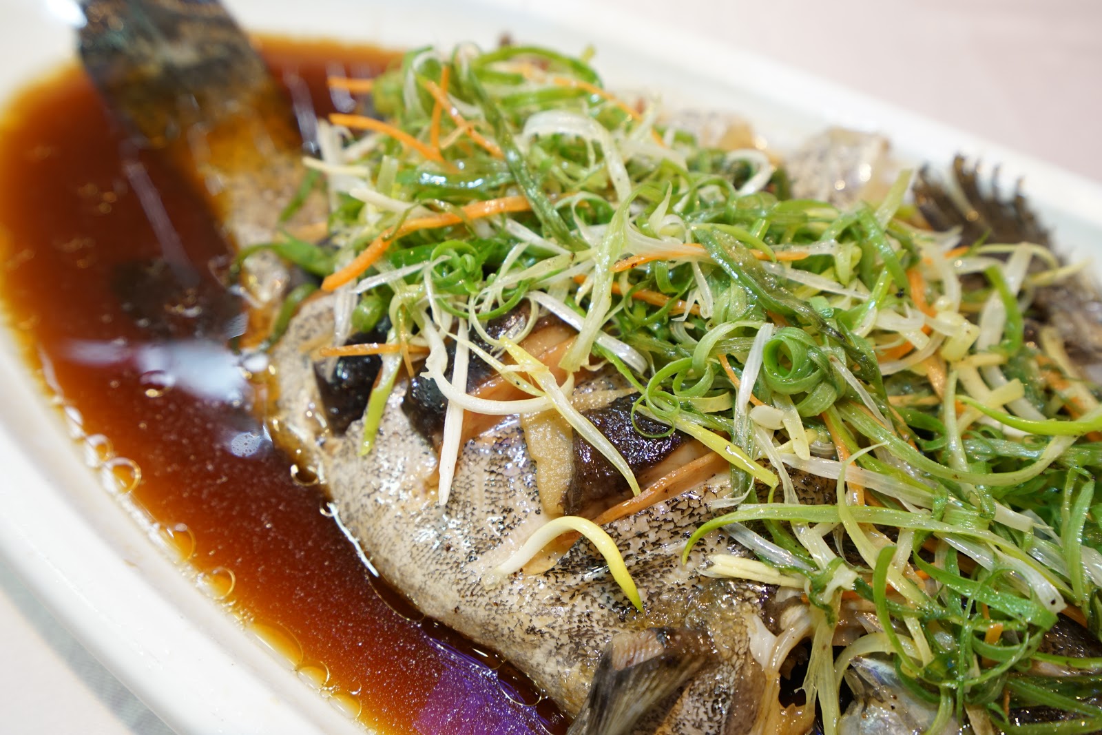 「甘露麒麟石斑魚」選用新鮮活石斑魚去蒸,再將香菇、薑片、火腿層層夾在魚肉中,火腿和香菇的滋味滲入魚肉當中,讓清甜的魚肉滋味更加豐富,鮮甜不已!