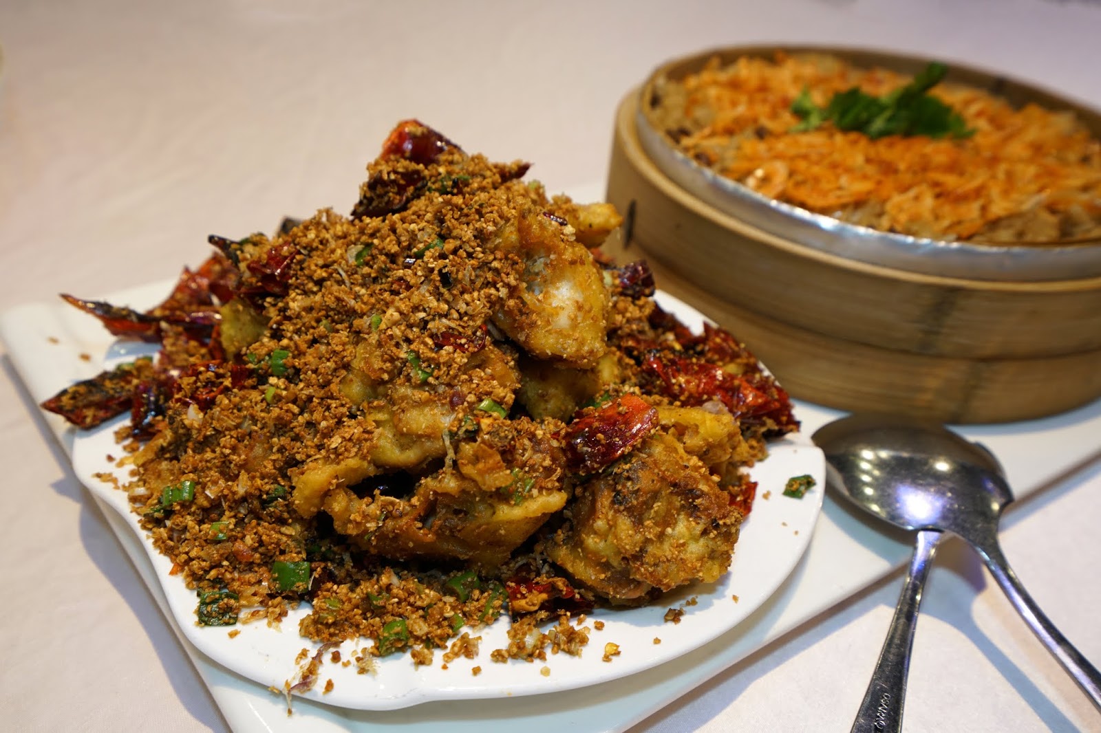 「黃金蟹櫻蝦米糕」是避風塘炒軟殼蟹與櫻花蝦米糕的組合,將軟殼蟹炸得酥香再與蔥薑蒜、辣椒一起炒,香氣十足、軟殼蟹層層香脆的口感,超好吃!