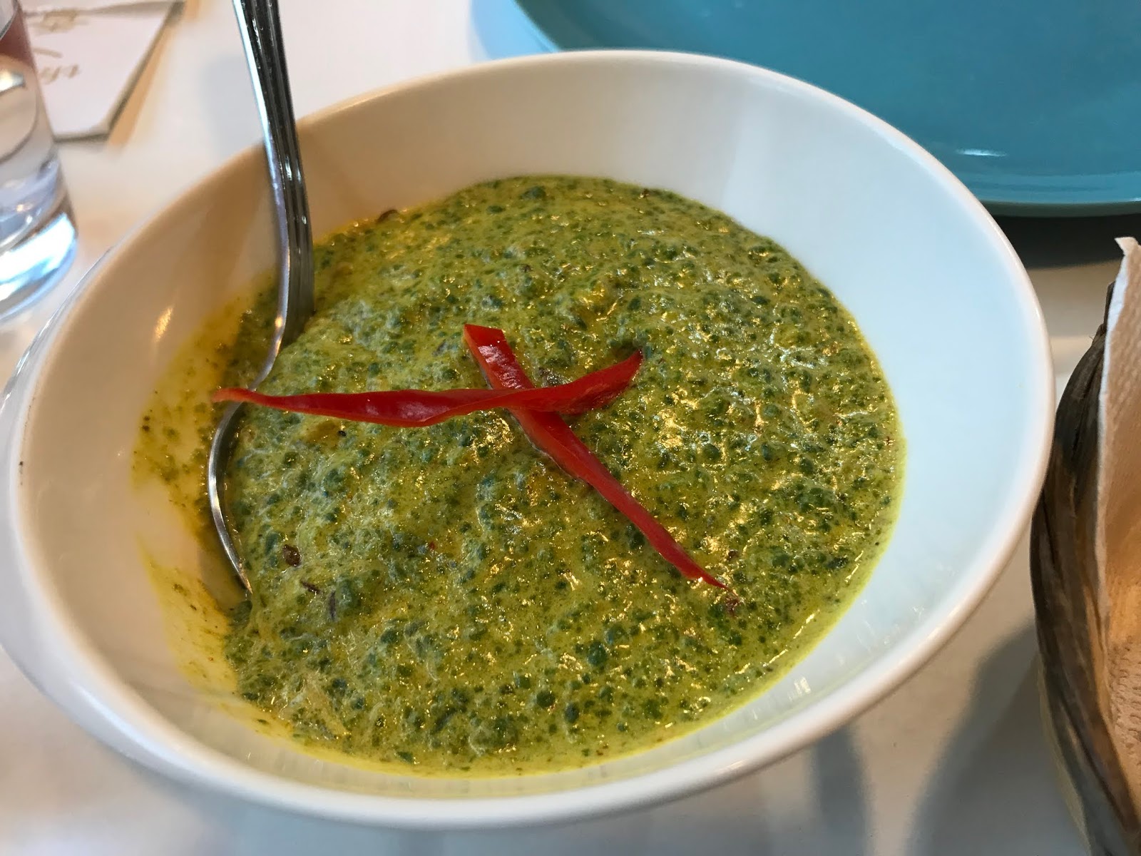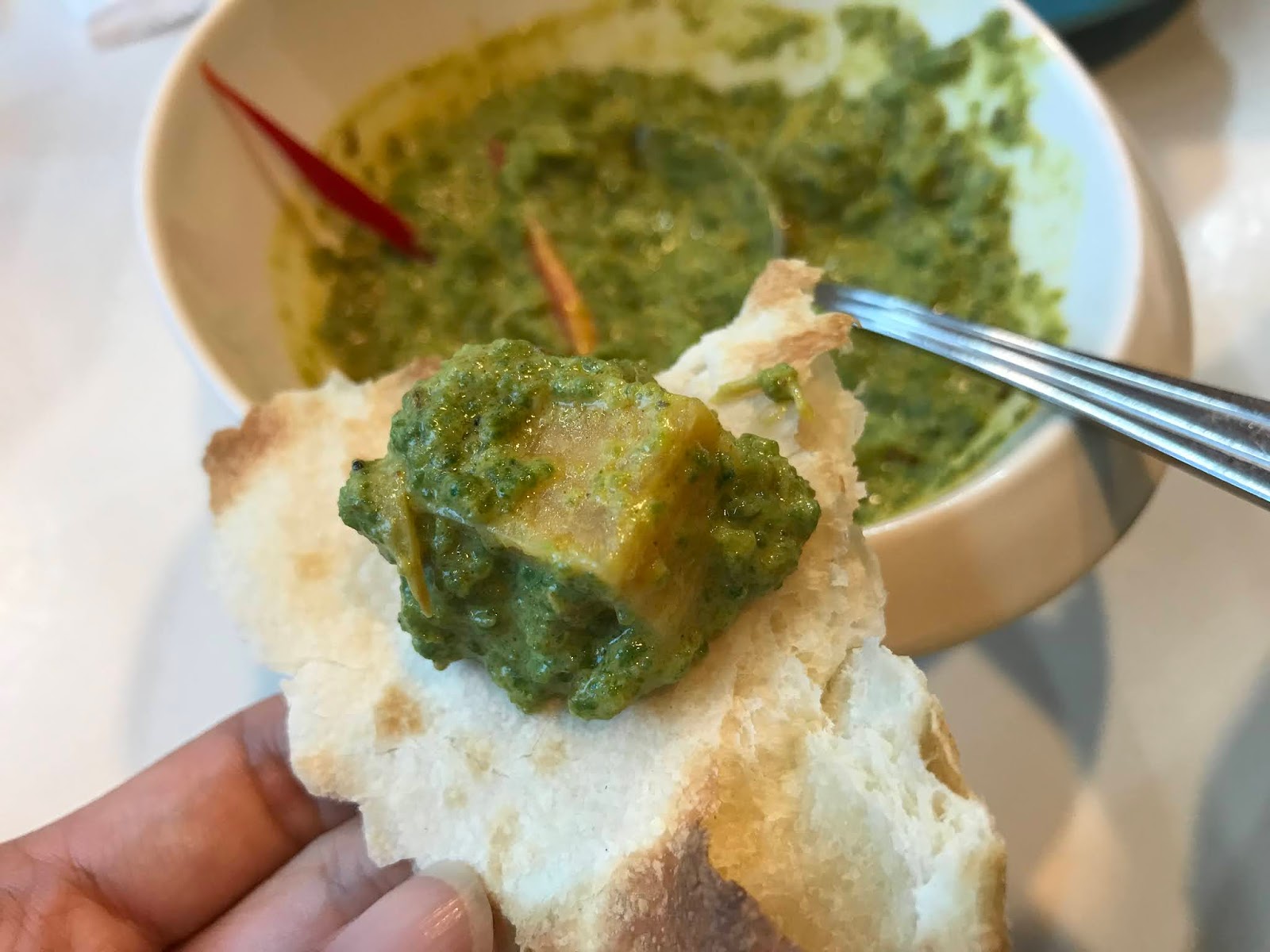濃郁的碎菠菜乳酪,香料滿滿的風味,裡面還有大塊的乳酪,用烤餅沾著滿滿的醬汁入口,好美味。