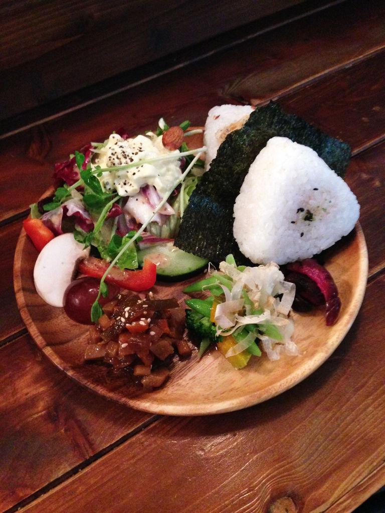 餐點內容包含:每日沙拉+每日配菜+兩個飯糰
