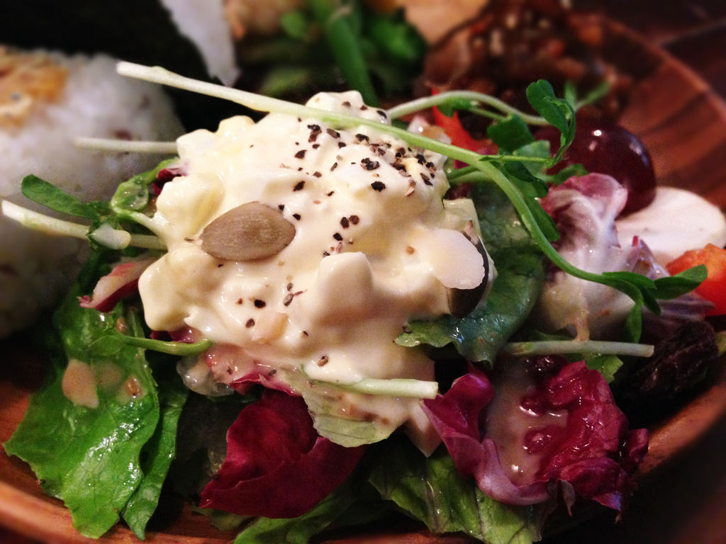 little ann 有吃到:生菜 甜椒 堅果粒 葡萄乾 水果 蛋沙拉 胡麻芥子醬