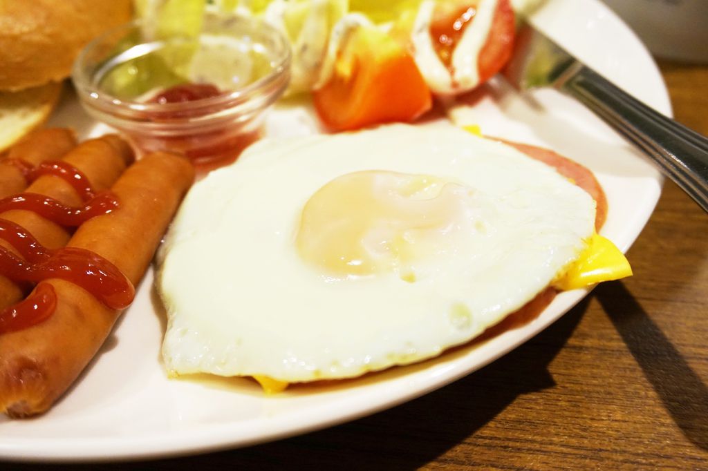 美式早午餐內容物有:貝果(或厚片吐司 2選1)太陽蛋、早餐腸、起司火腿 和 一小份沙拉