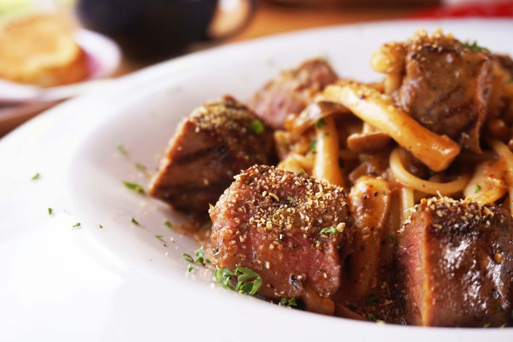 麵的部分是以紅酒醬搭配各式菇類下去拌炒而成