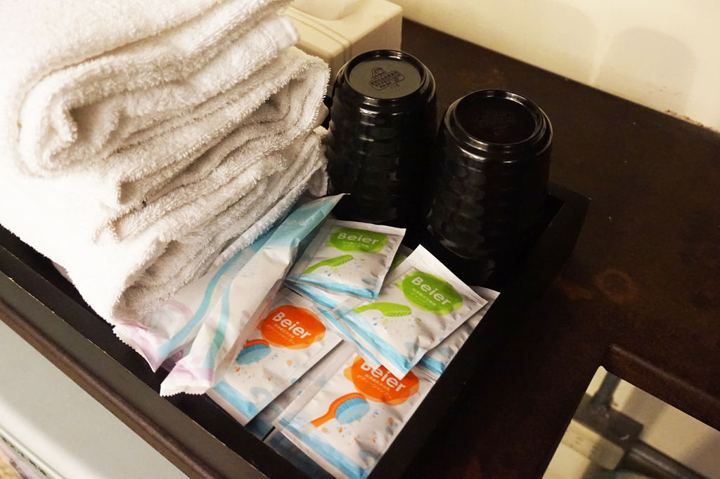 房間內備品有:大浴巾、牙刷、牙膏、杯子、吹風機、沐浴乳、洗髮精