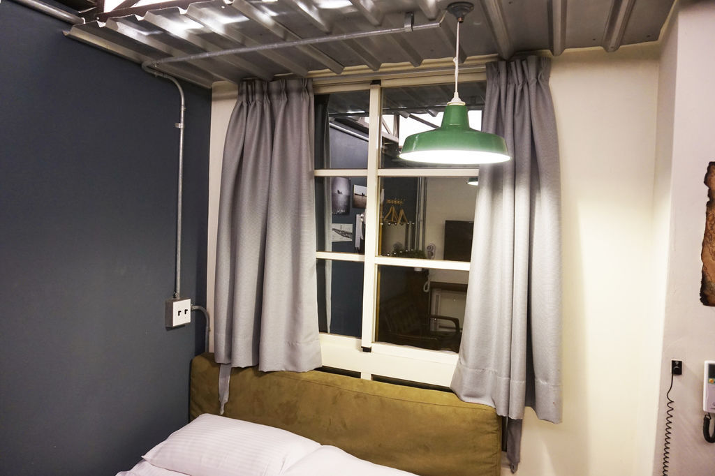 整個房間以土耳其藍牆面搭配粗曠氣息工業風與明亮潔白的床來做組合