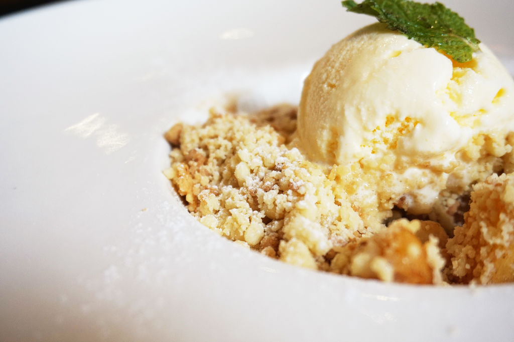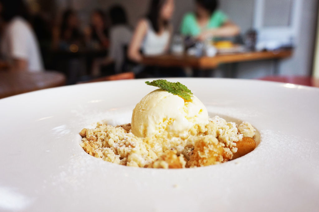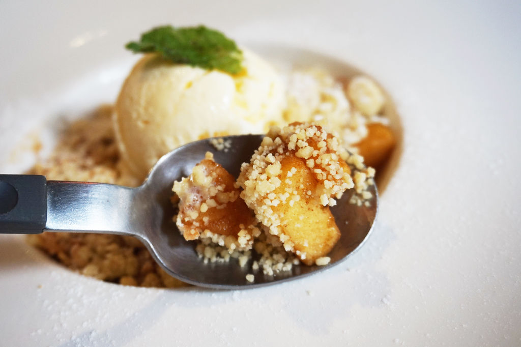 配上搗碎的塔餅與冰涼香甜的明治香草冰淇淋,這清新香甜的滋味讓人想忘也難呀~