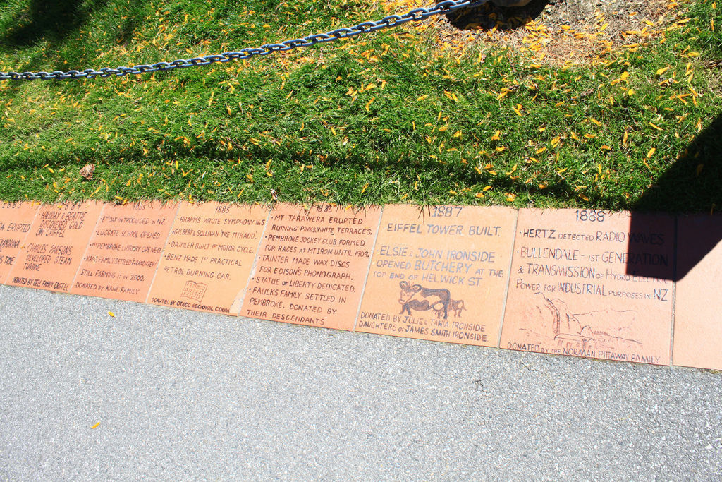 湖邊就有停車場,很幸運地幫老dra找到一口位子。人行道的磚排上刻畫著當地的歷史,在這麼與大自然相融的地方,多添一筆人文的氣息;