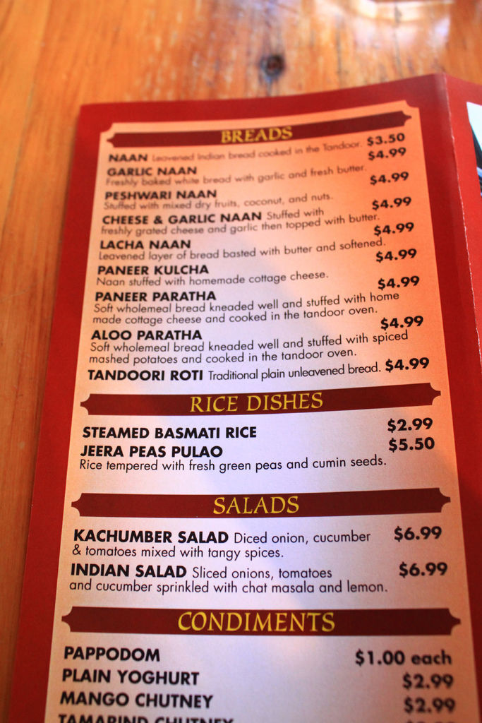 我一直都很討厭印度菜,台灣印度餐廳給我的印象是:所有的咖哩吃起來都是一樣的,只是顏色不一樣、裡面的肉不一樣,但我的嘴巴的感覺跟鼻子聞到的味道就是完全一樣。超小碟就算了,搭配的餅也很無聊。薄薄小小一片沒味道又貴鬆鬆。