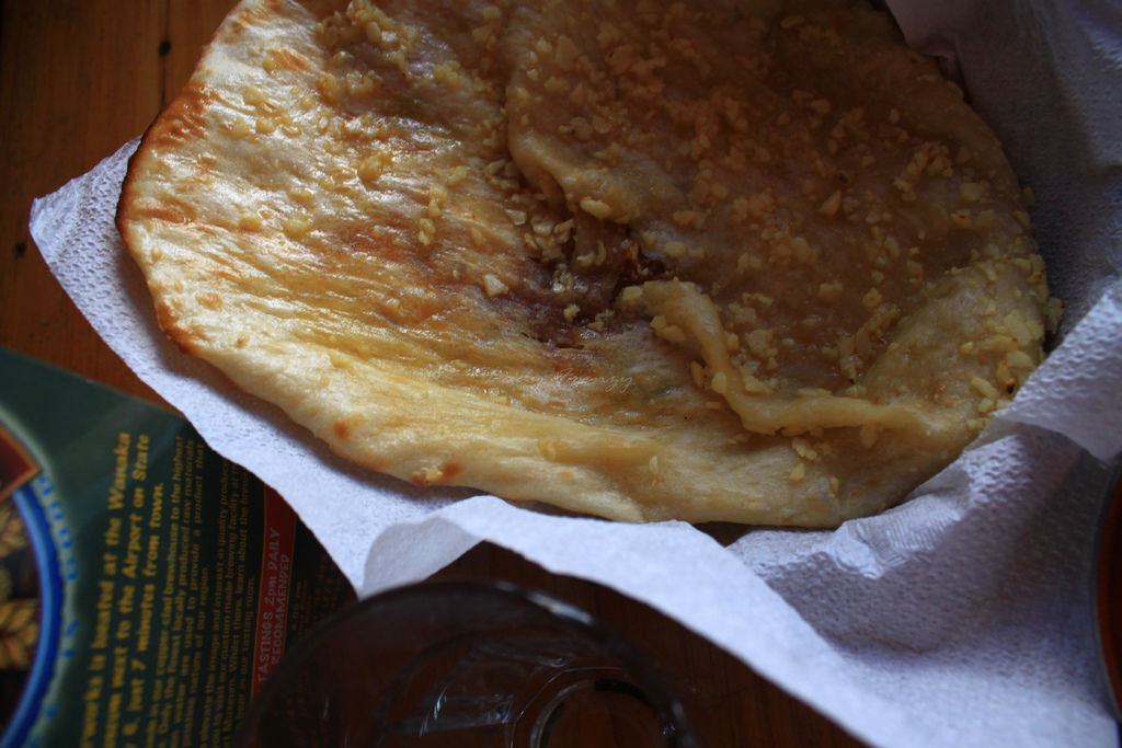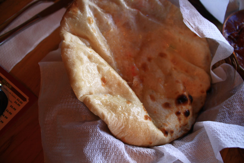 轟!吃到的第一口,這是我腦海裡的聲音,因為太感動了,跟愛爾蘭一樣的好吃。我找不到一樣的口味,當初室友點的是被染得紅紅的椰子蘇;這次我點蒜香(Garlic Naan)、跟甜的Peshwari Naan,兩個Naan送來的時候都好澎。