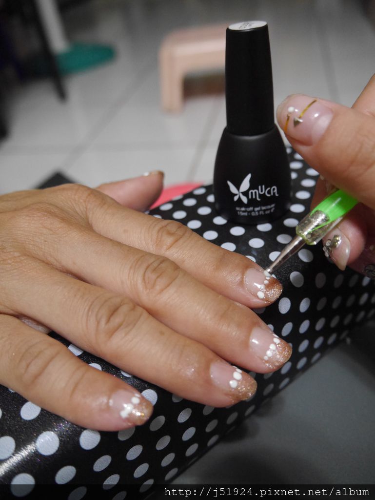 我最常就是利用點珠筆點上圓點遮住,像我這次就用了白色的光療指甲油在接縫地方