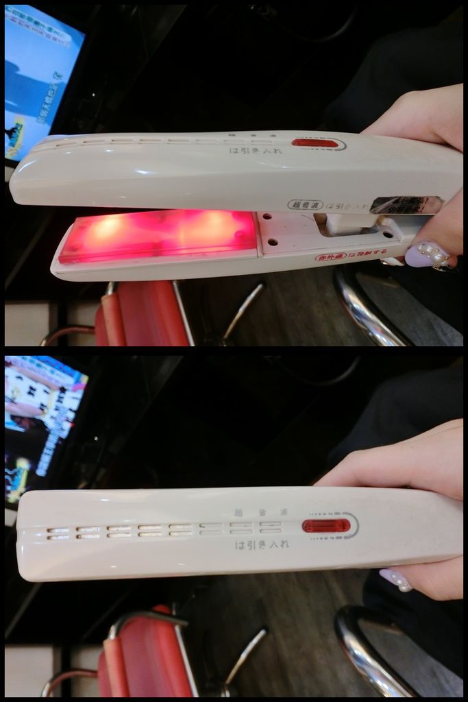 在均勻塗抹結構式護髮第二劑之後,使用遠紅外線超音波護髮夾稍為夾頭髮,