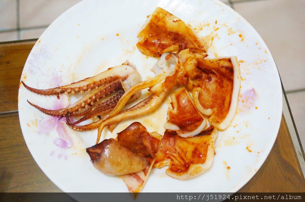 沾了烤肉醬金黃厚實的切片魷魚,都流口水了我xDD