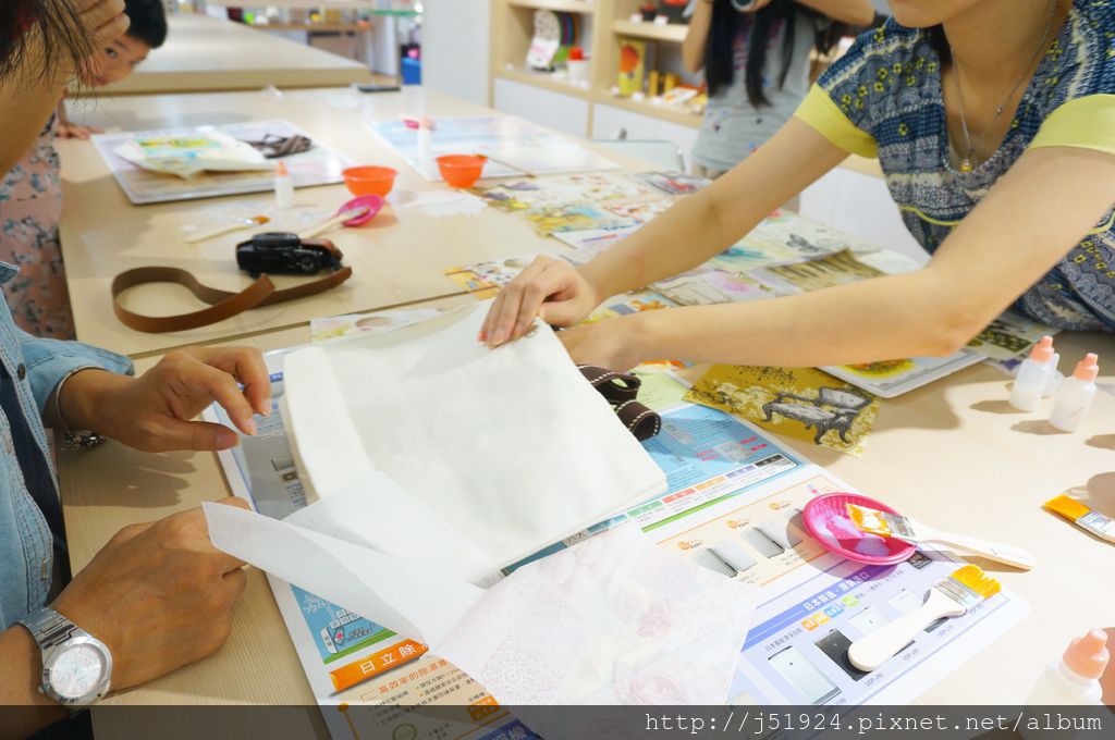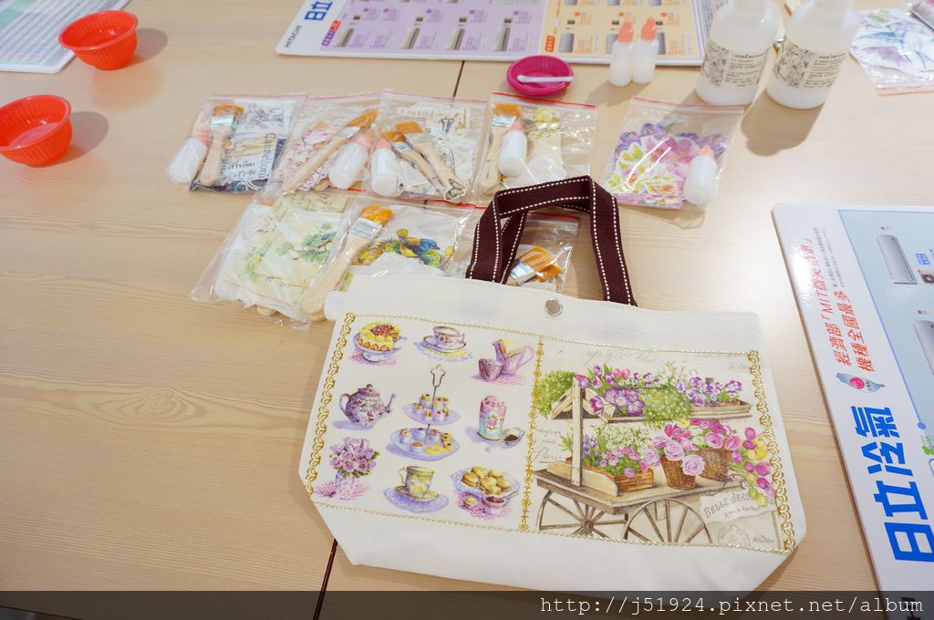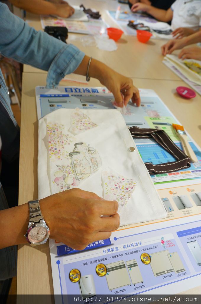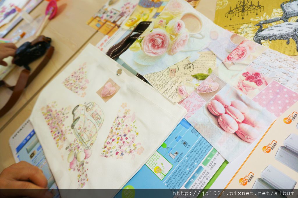 擺放好後老師會開始讓大家使用『蝶谷巴特』專用一劑將蝶谷巴特專用紙巾填貼在提袋上,