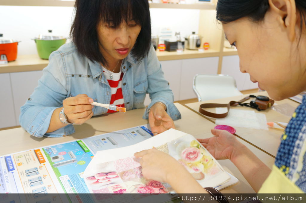 像我老媽在製作過程中發現紙巾沒有貼平,老師很有耐心的在一旁幫忙媽媽,