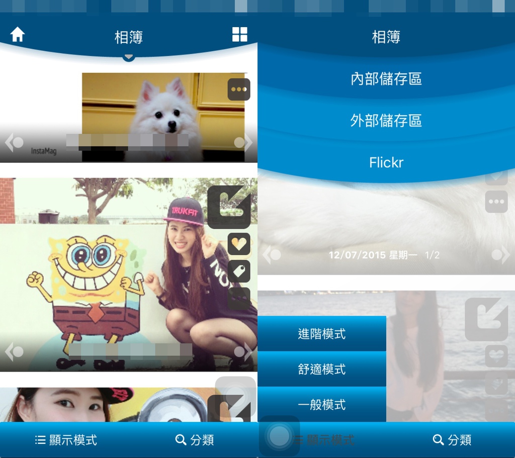 點選上方「相簿」向下拉可看內部、外部儲存區和Flicr內的照片,
