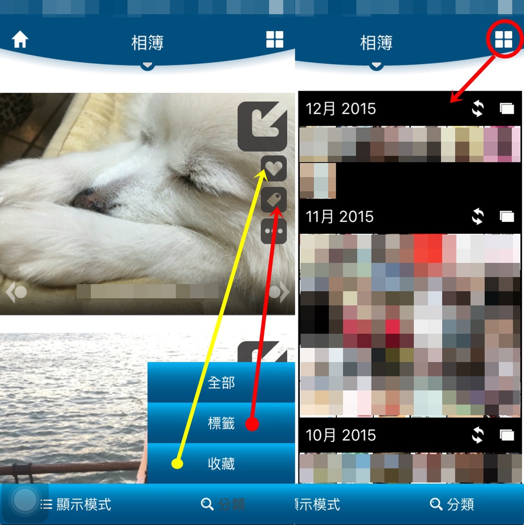 右上角則是會出現一個像魔術方塊的四方形,點開後會將所有照片依照年、月、日分類,