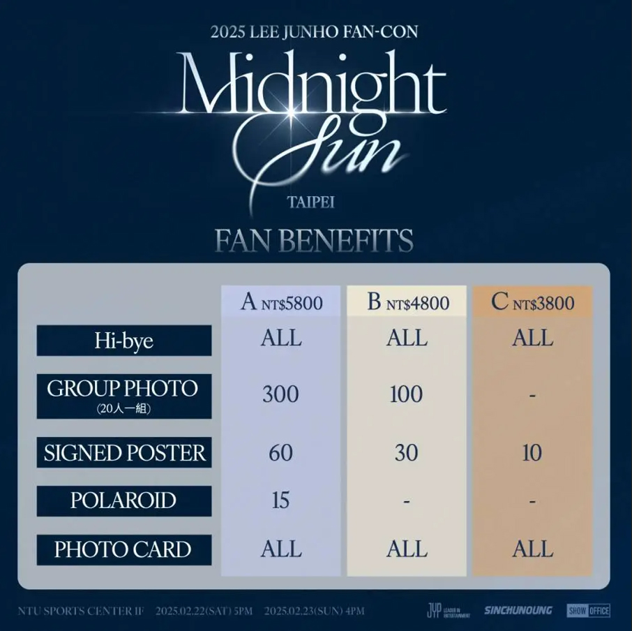 「2025 LEE JUNHO FAN-CON in TAIPEI」將在2月22日(六)下午五點與23日下午四點,於國立臺灣大學綜合體育館1樓舉辦。票價區分為A區NT$5800元、B區NT$4800元、C區NT$3800元以及愛心席NT$2900元。門票已於Ticket Plus遠大售票網站及全台7-11 ibon機台全面開賣。最寵粉的李俊昊也給出超強福利,兩天FAN-CON上,均會與全場所有HOTTEST歡送與致贈典藏小卡,以及20人一組,每場共與400名粉絲合照、100張親簽海報與15張拍立得。