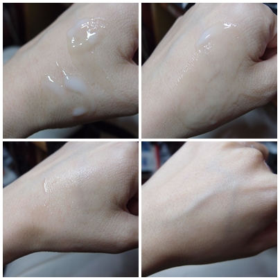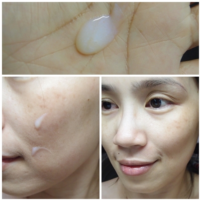 白色半透明的凝露狀,不明顯的香味,推開精萃的像是絲質般的觸感,有擦上精萃的部位變得很柔嫩保水。